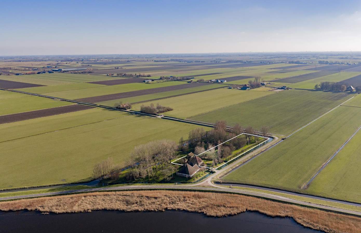 Als u het erf op rijdt is via de brug is de eerste ca. 15 meter mandelig met de voorgelegen stolphoeve (Noordschermerdijk 6). Samen maakt u gebruik van de oprit en bent u verantwoordelijk voor het onderhoud. Het erf is met zorg en visie aangelegd en voelt als een park in het open polderlandschap. De tuin is met zorg aangelegd, met gazons, volwassen bomen, een boomgaard met fruitbomen en natuurlijke waterpartijen die het licht en de luchten weerspiegelen. Elzen, populieren en knotwilgen omzomen het perceel en zorgen voor beschutting en privacy, terwijl doorkijkjes juist het weidse landschap benadrukken. Verspreid over het perceel bevinden zich meerdere plekken om te zitten, te genieten van de zon of juist de schaduw op te zoeken. Daarnaast bevinden zich karaktervolle opstallen op het perceel, waaronder een robuuste houten kapschuur met rieten dak en een authentieke hooiberg. Hier woont u op uw eigen omsloten domein van rust, door water en natuur, met rondom het uitgestrekte Noord-Hollandse landschap als adembenemend decor.