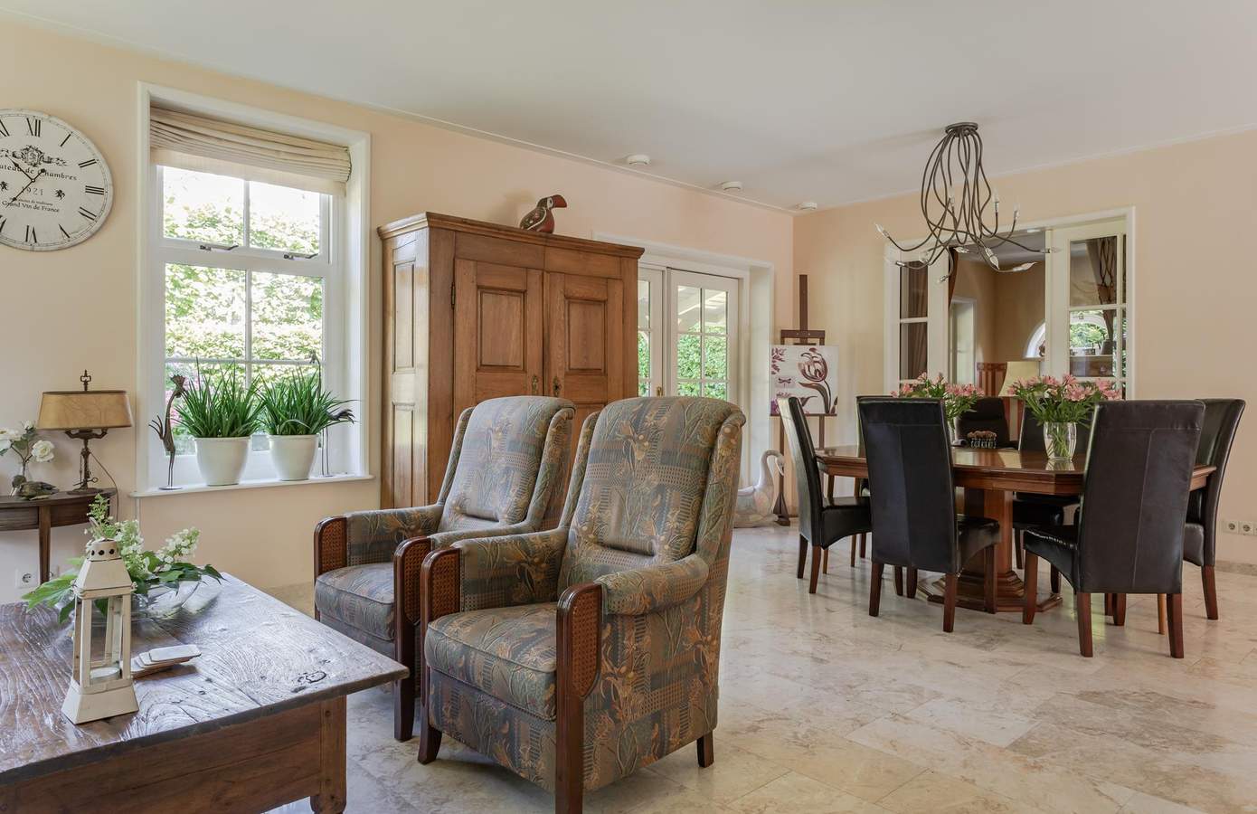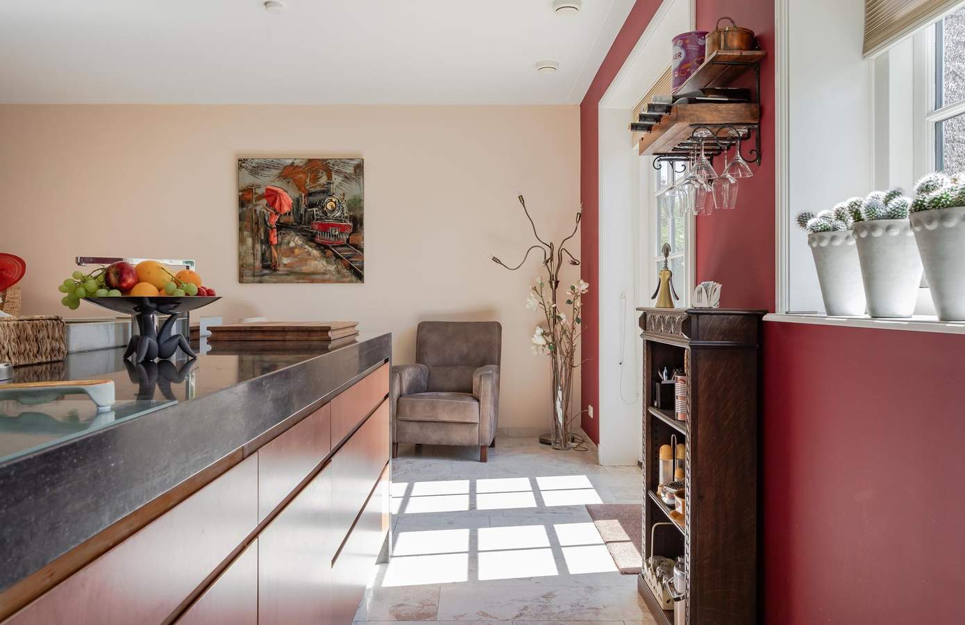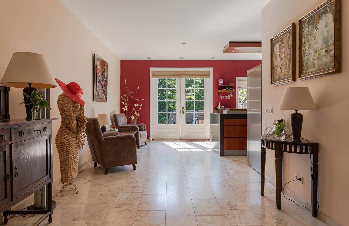 Bij binnenkomst in de hal ervaart u meteen de fijne ambiance. In de ruime hal is de trapopgang, meterkast, het toilet en de toegang tot zowel de living als de keuken. De living is heerlijk licht door de vele raampartijen. In de op maat gemaakte keuken is op werkelijk niets bezuinigd, het is een robuust exemplaar met Belgisch hardstenen werkblad. De openslaande deuren in de keuken geven toegang tot het terras aan de zijkant. In de living is een deur welke toegang geeft tot de riante veranda, een fantastisch verlengstuk van uw woongenot. De ensuite deuren verbinden de living met de tv-kamer. Een multifunctionele kamer welke uitstekend ingericht kan worden als slaapkamer. Grenzend aan deze kamer is de luxe badkamer met dubbele wastafel, vrijstaand bad en een ruime inloopdouche. Terugkomend in de hal brengt de fraaie eikenhouten trap, een prachtig stuk meubelmaatwerk, u naar de verdieping. Hier is een slaapkamer, badkamer en een inloopkast. De vide geeft tal van mogelijkheden om naar eigen wens ingericht te worden, zo kunnen hier nog meerdere slaapkamers worden gecreëerd.