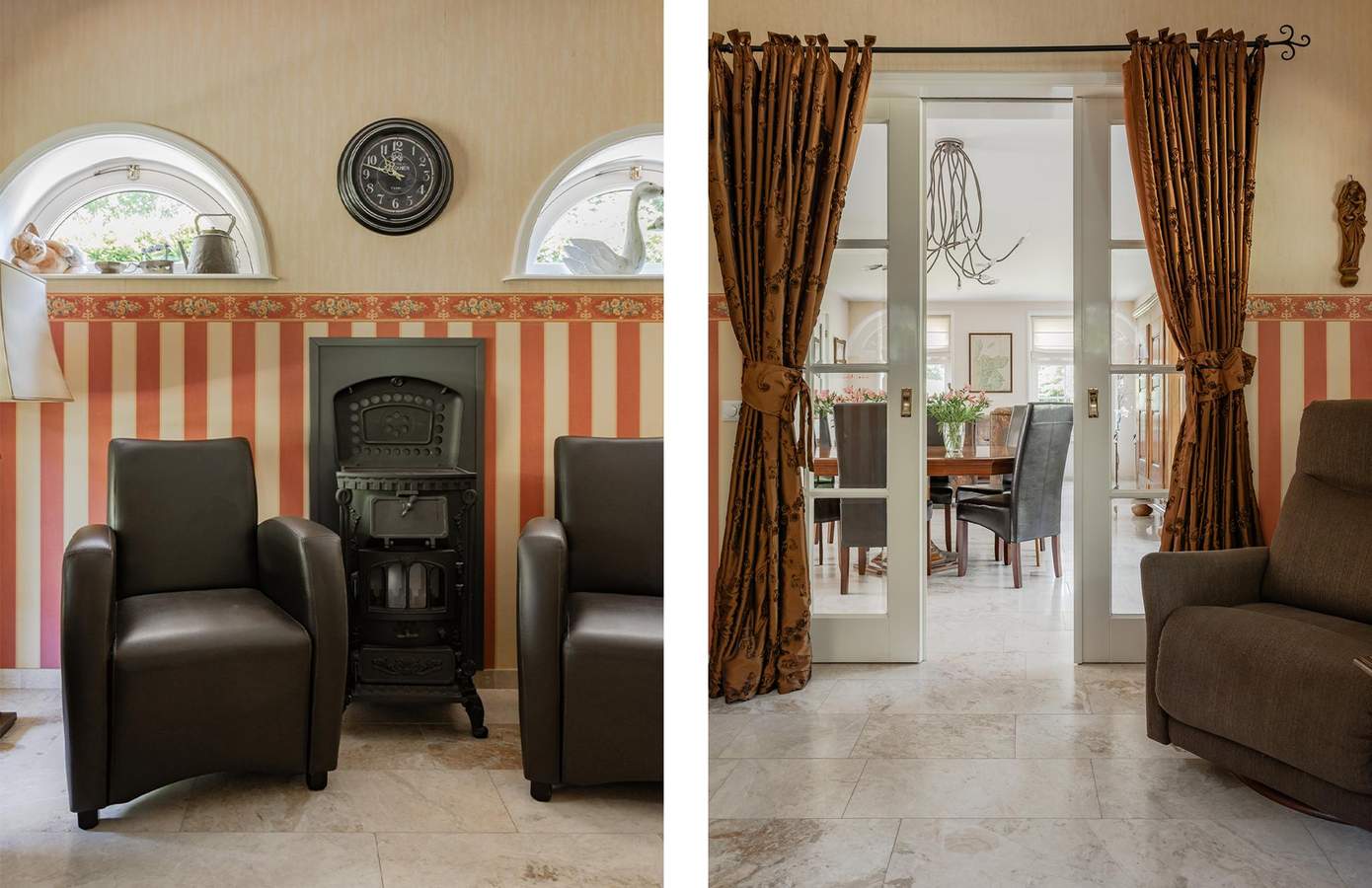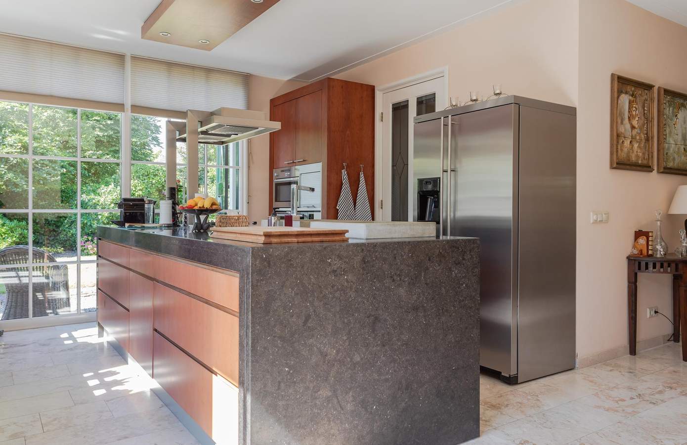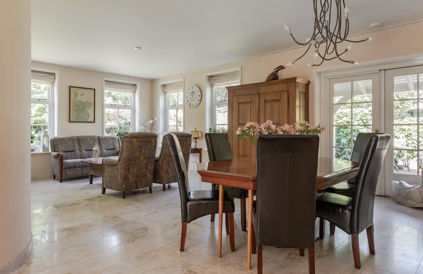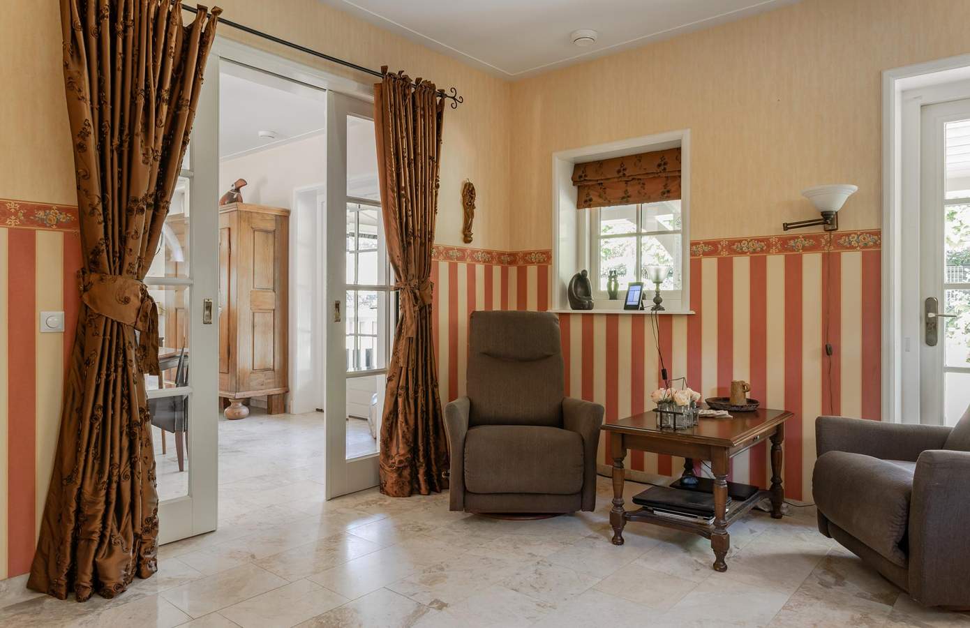 Bij binnenkomst in de hal ervaart u meteen de fijne ambiance. In de ruime hal is de trapopgang, meterkast, het toilet en de toegang tot zowel de living als de keuken. De living is heerlijk licht door de vele raampartijen. In de op maat gemaakte keuken is op werkelijk niets bezuinigd, het is een robuust exemplaar met Belgisch hardstenen werkblad. De openslaande deuren in de keuken geven toegang tot het terras aan de zijkant. In de living is een deur welke toegang geeft tot de riante veranda, een fantastisch verlengstuk van uw woongenot. De ensuite deuren verbinden de living met de tv-kamer. Een multifunctionele kamer welke uitstekend ingericht kan worden als slaapkamer. Grenzend aan deze kamer is de luxe badkamer met dubbele wastafel, vrijstaand bad en een ruime inloopdouche. Terugkomend in de hal brengt de fraaie eikenhouten trap, een prachtig stuk meubelmaatwerk, u naar de verdieping. Hier is een slaapkamer, badkamer en een inloopkast. De vide geeft tal van mogelijkheden om naar eigen wens ingericht te worden, zo kunnen hier nog meerdere slaapkamers worden gecreëerd.
