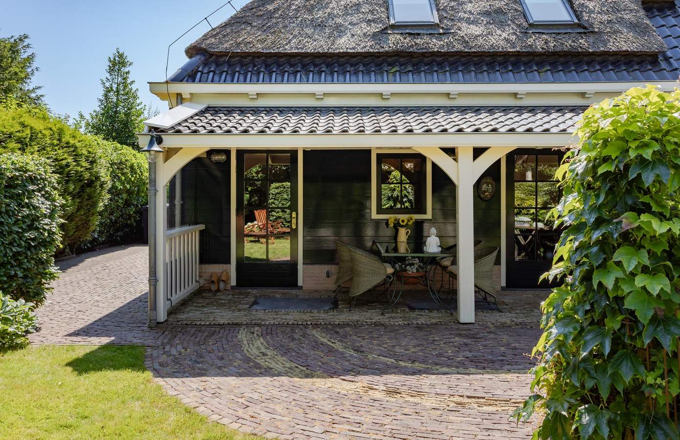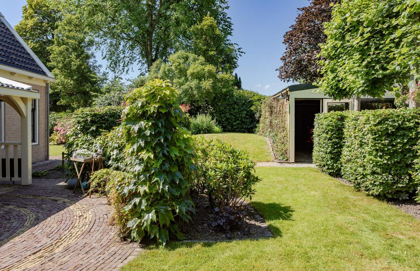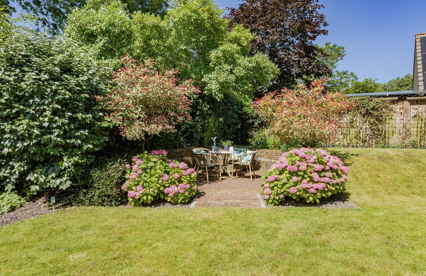De onder architectuur aangelegde tuin ligt rondom de woning. Aan de voorzijde is de oprit met plaats voor meerdere auto’s op eigen terrein, een gazon en diverse plekken waar u heerlijk van de tuin kunt genieten. Aan de zijkanten en achterzijde geniet u van de privacy volle en fraai aangelegde tuin; compleet met sierhagen, borders met vaste beplanting, een gazon en de riante veranda. Dit is echt een lust voor het oog! De vrijstaande garage met 12 zonnepanelen biedt plaats aan twee auto’s. In de tuin staat tevens het bijgebouw, compleet in stijl met de woning, waar plek is voor bijvoorbeeld uw tuingereedschap. Met een aantal kleine aanpassingen kunt u het bijgebouw omtoveren tot bijvoorbeeld een kantoor/werkplek aan huis.