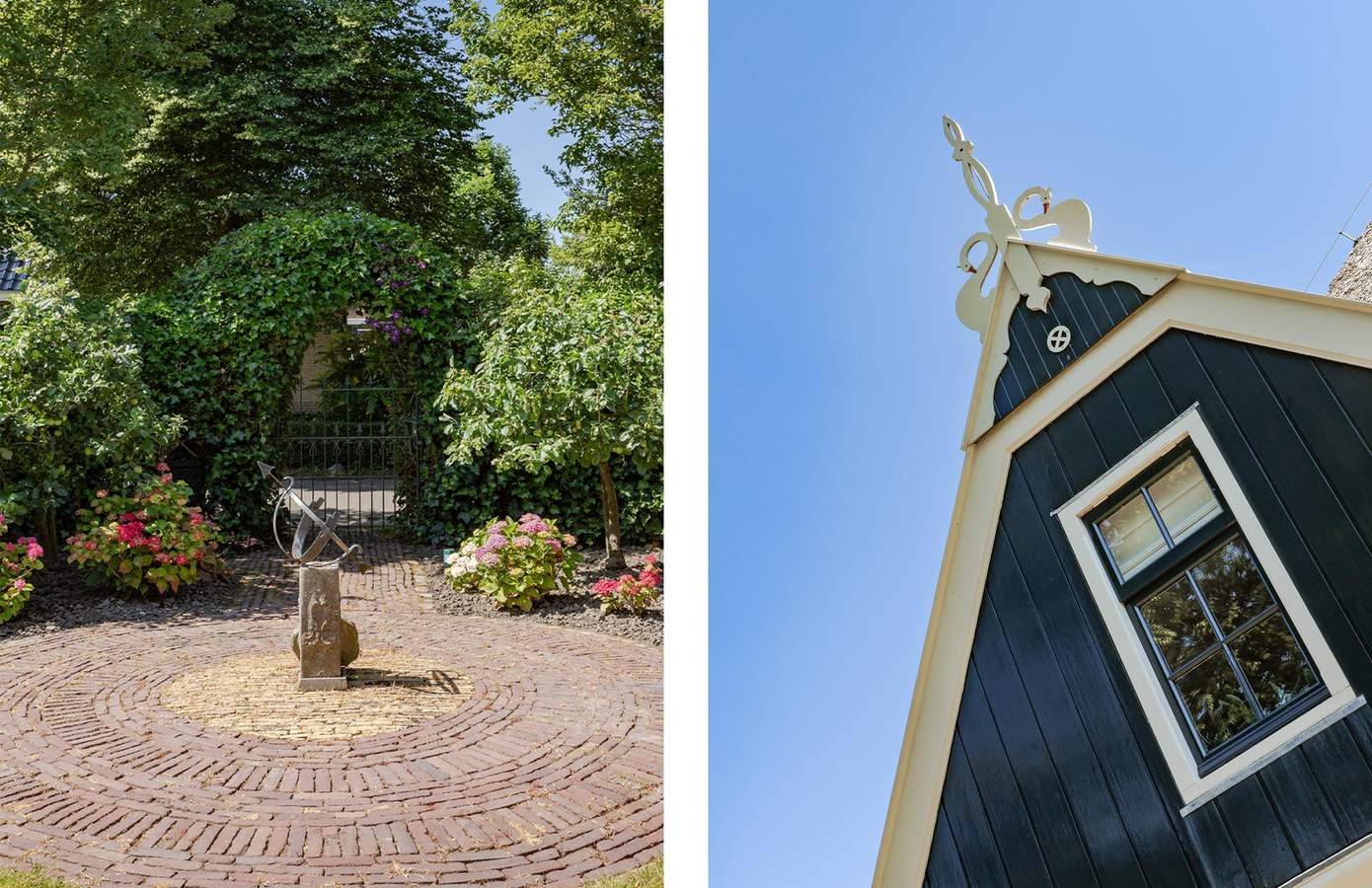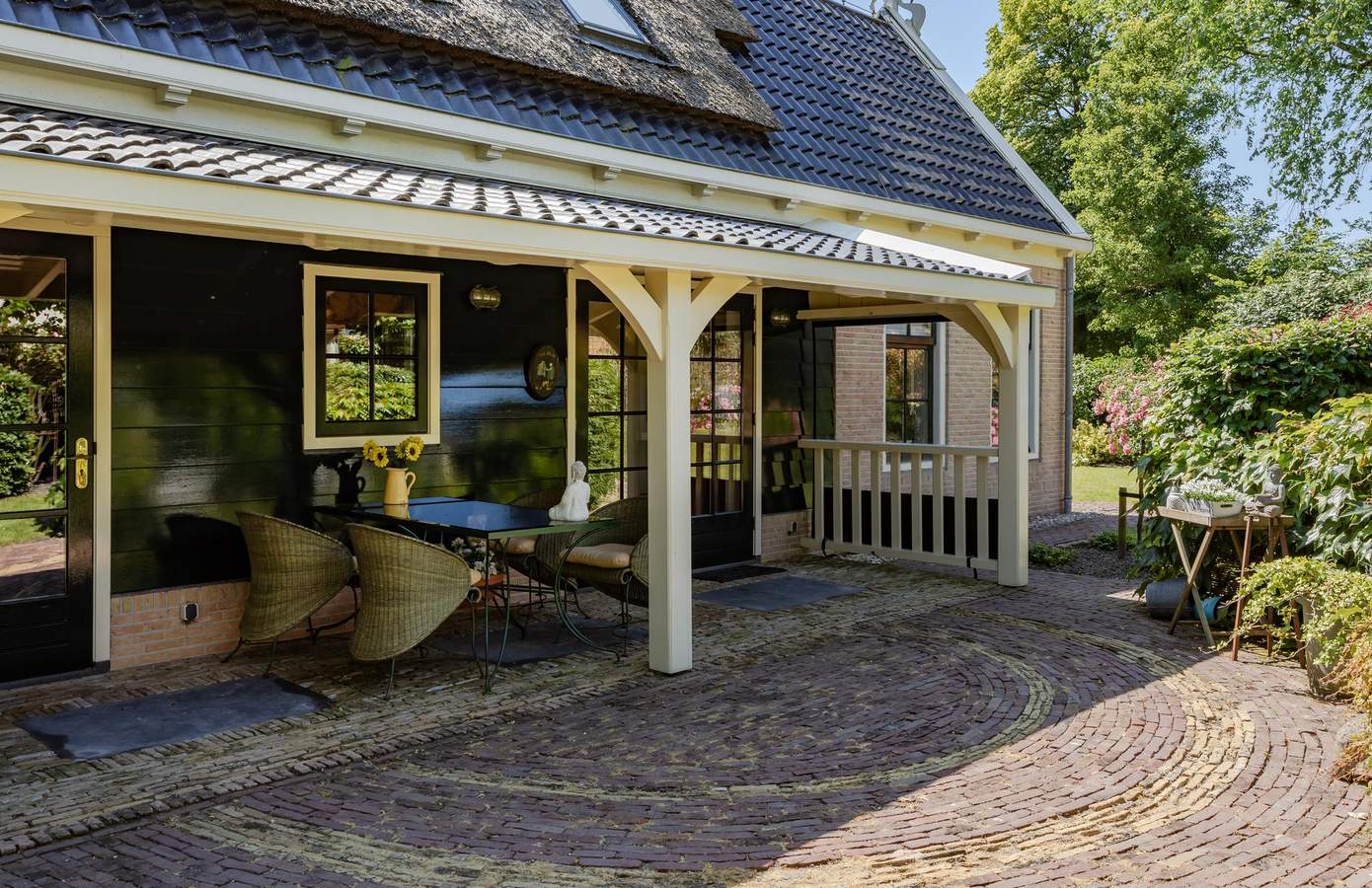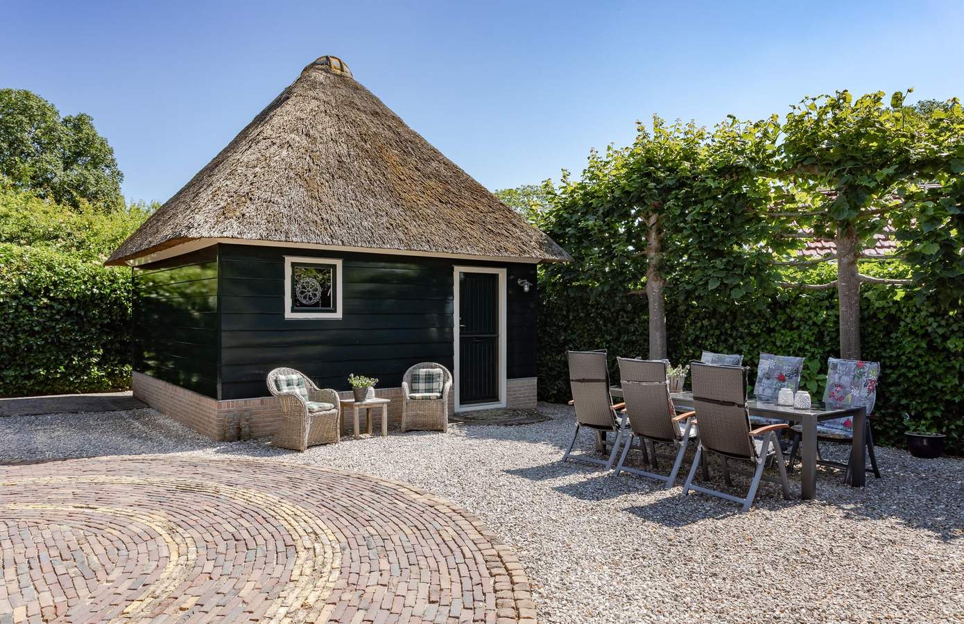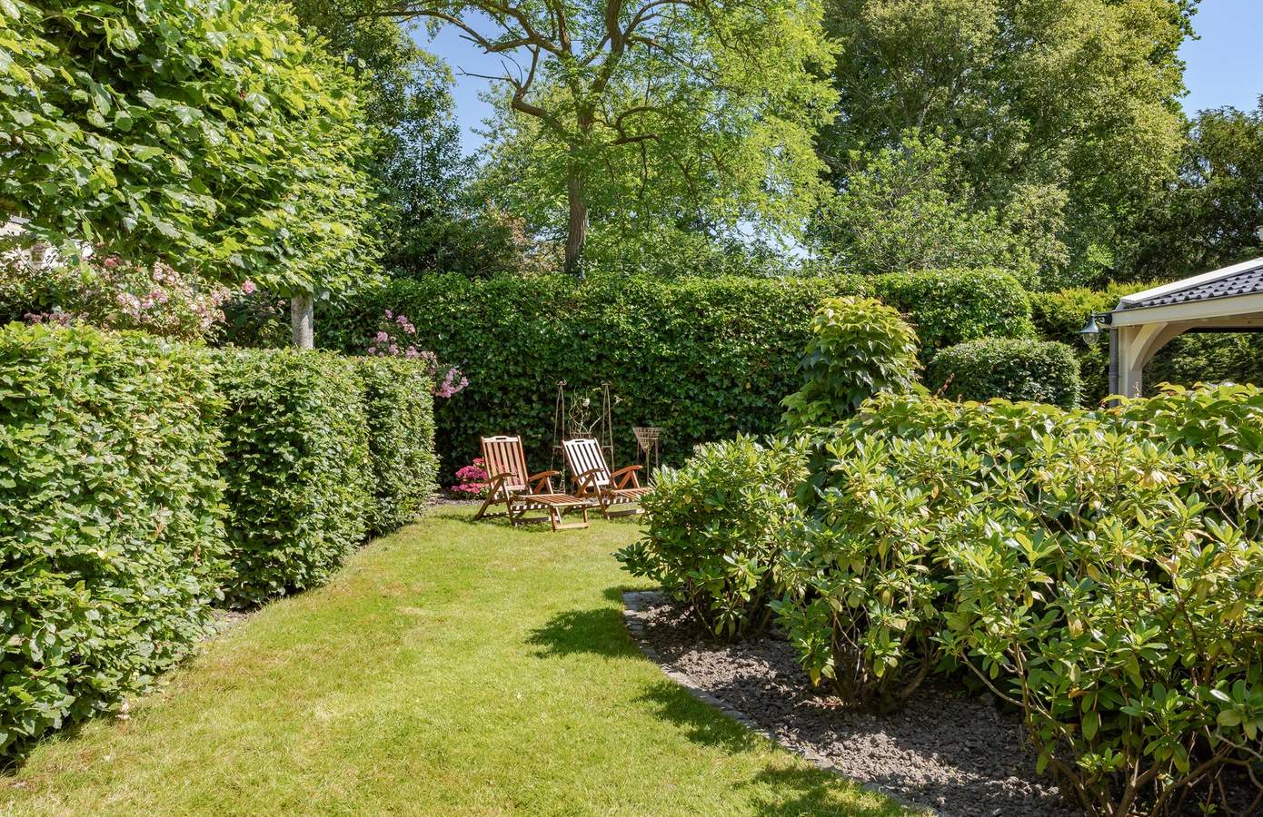 De onder architectuur aangelegde tuin ligt rondom de woning. Aan de voorzijde is de oprit met plaats voor meerdere auto’s op eigen terrein, een gazon en diverse plekken waar u heerlijk van de tuin kunt genieten. Aan de zijkanten en achterzijde geniet u van de privacy volle en fraai aangelegde tuin; compleet met sierhagen, borders met vaste beplanting, een gazon en de riante veranda. Dit is echt een lust voor het oog! De vrijstaande garage met 12 zonnepanelen biedt plaats aan twee auto’s. In de tuin staat tevens het bijgebouw, compleet in stijl met de woning, waar plek is voor bijvoorbeeld uw tuingereedschap. Met een aantal kleine aanpassingen kunt u het bijgebouw omtoveren tot bijvoorbeeld een kantoor/werkplek aan huis.