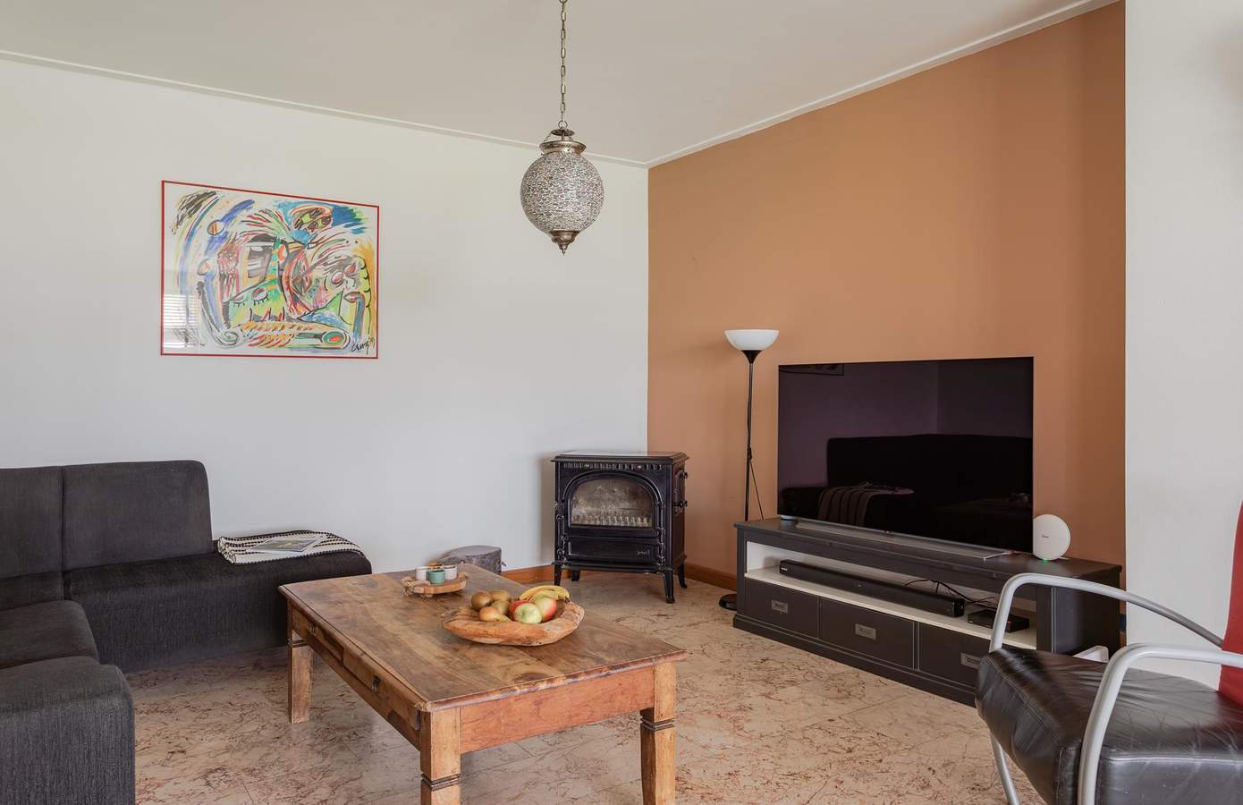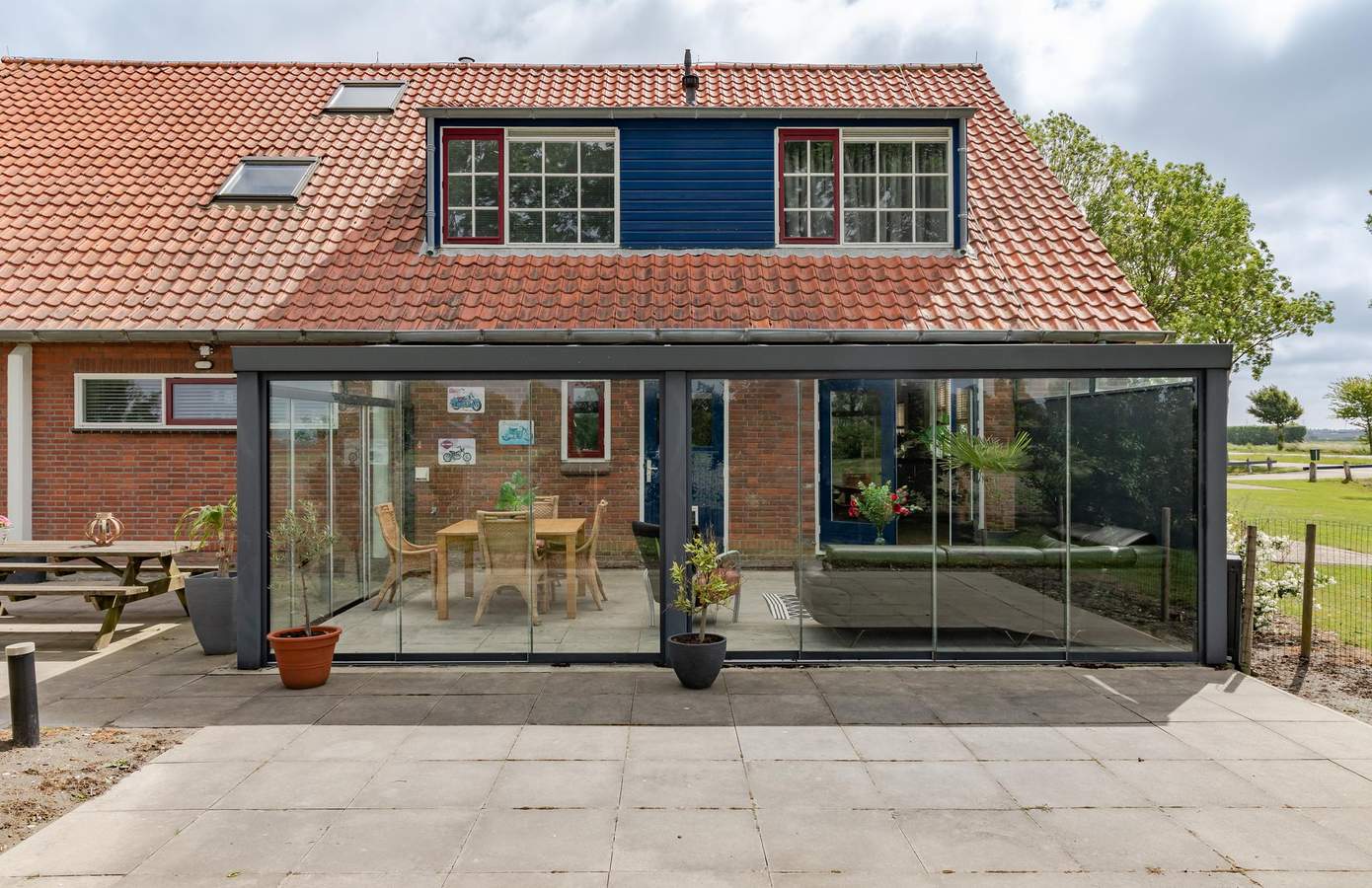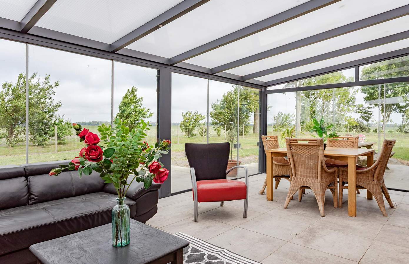 Via de zij-entree komt u binnen in de hal. Hier vindt u de trap naar de eerste verdieping, een handig kelderkast en de toegang tot de woonkamer. Bij het betreden van de woonkamer ervaart u direct een warme, huiselijke sfeer. Dankzij de grote raampartijen is de ruimte heerlijk licht en geniet u van een prachtig uitzicht over de landerijen. Aan de zijkant bevindt zich een extra zithoek op een prachtige marmeren vloer met vloerverwarming. De open leefkeuken is compleet uitgerust, onder meer met een koelkast, vaatwasser en afzuigkap. Vanuit de keuken loopt u zo de serre in, waar u het hele jaar door van het buitenleven kunt genieten.