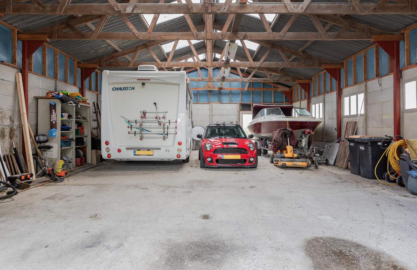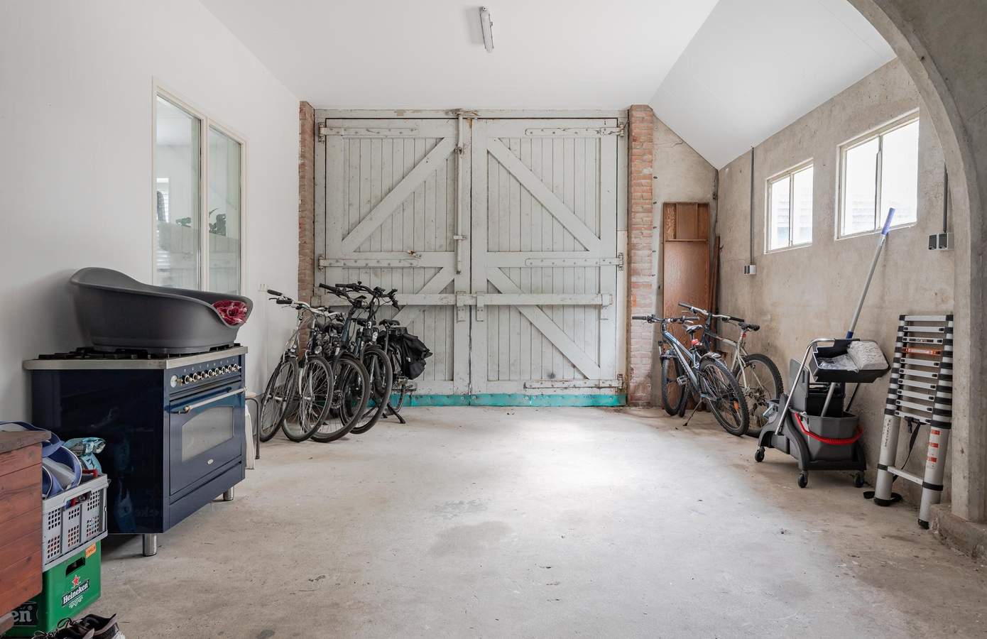 Deze ruimte leidt naar de inpandige garage, ooit een paardenstal; de authentieke hooiruif herinnert daar nog aan. De garage is voorzien van water en elektra en biedt, via twee openslaande dars deuren, plaats aan uw auto.