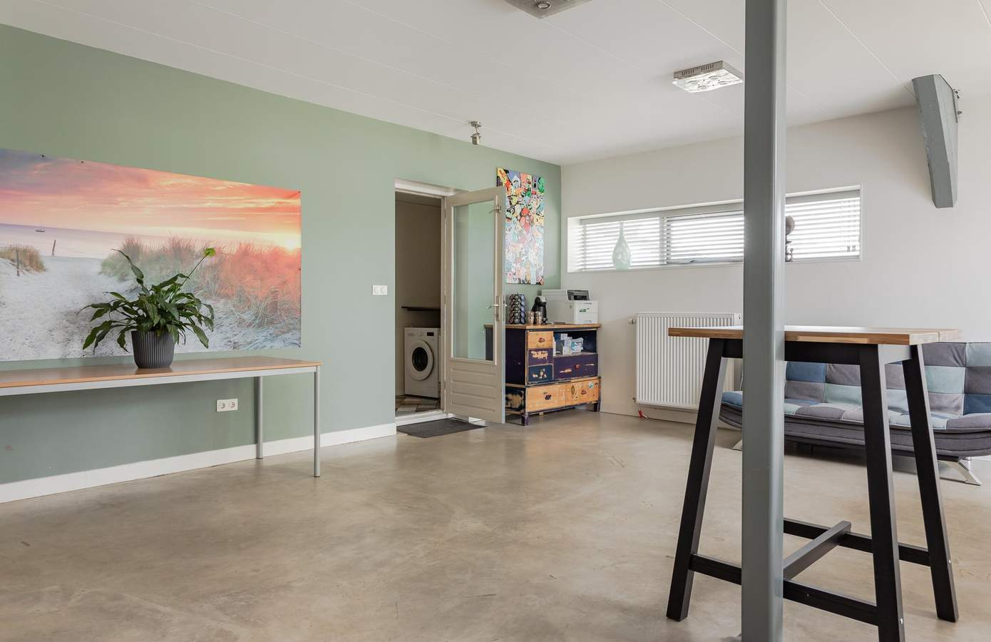 Aansluitend ligt de bijkeuken, een praktische ruimte met toilet, meterkast, wasmachineaansluiting en doorgang naar de achtertuin. Vanuit de bijkeuken bereikt u een royale (werk)kamer, ideaal als kantoor of voor gelijkvloers wonen.