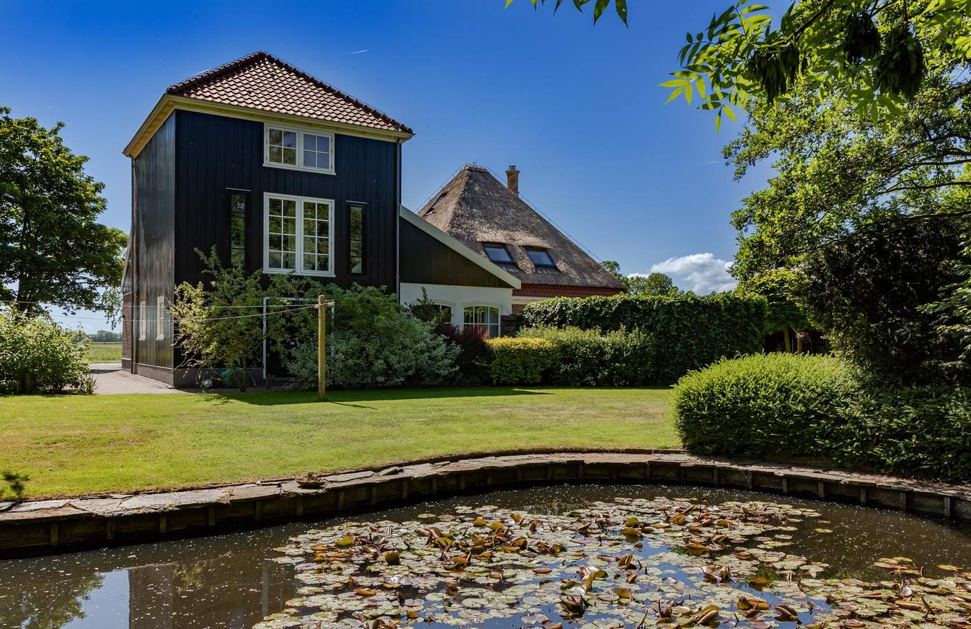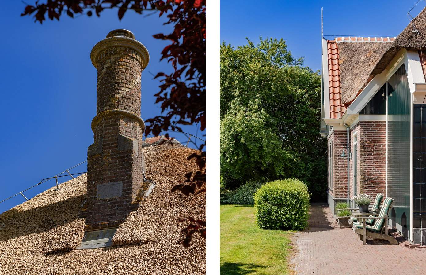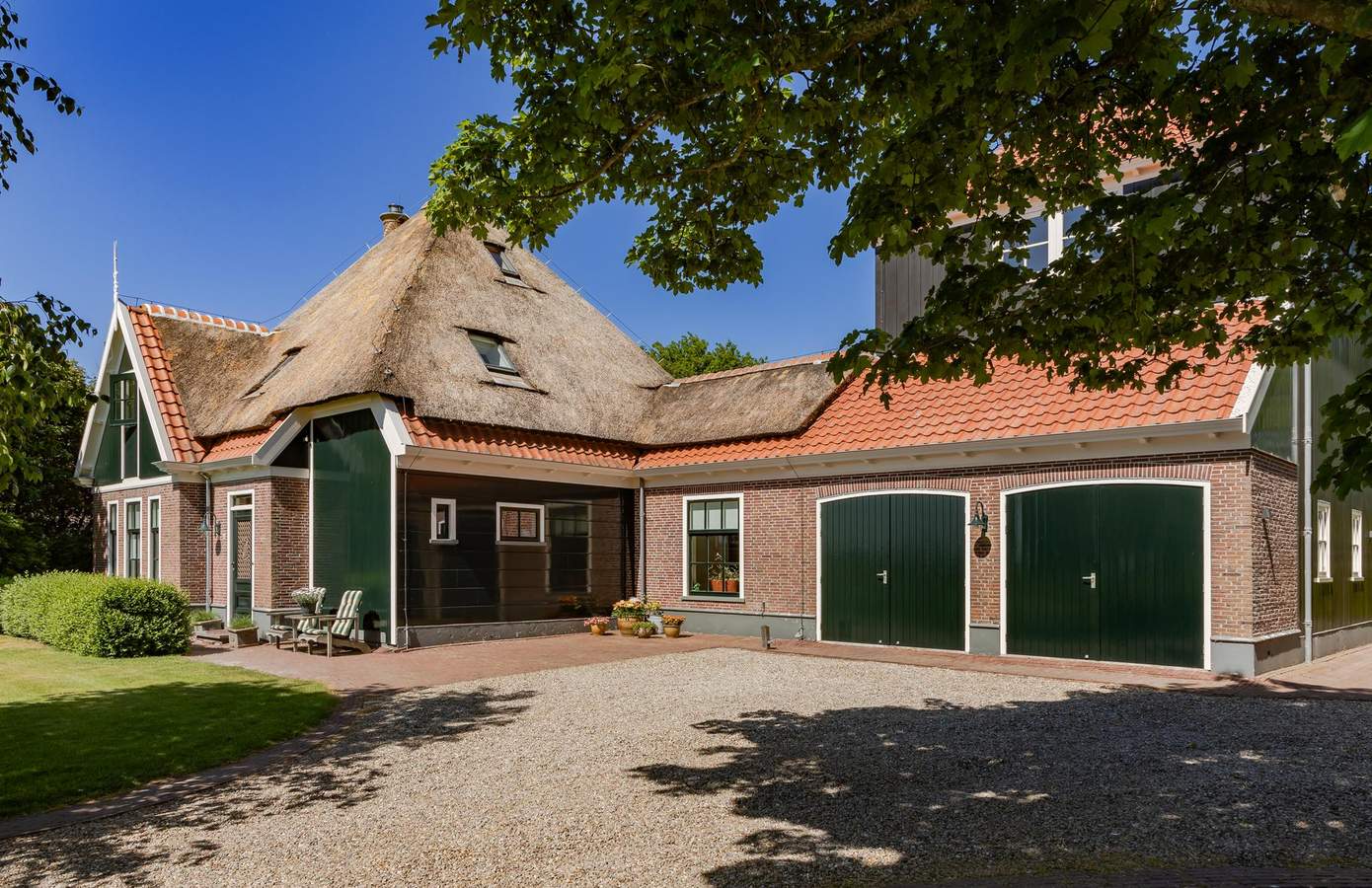 Aan de rustige Korte Bosweg, net buiten de bebouwde kom van ’t Zand, staat deze in 2002 traditioneel gebouwde stolpwoning met kapberg. De donkergroene houten geveldelen, grote boerderijramen en de imposante ronde schoorsteen vormen samen een tijdloos gevelbeeld. Het rieten dak – uitgerust met sprinklerinstallatie en bliksemafleider – legt een warme deken over de stolp. De kenmerkende kapberg herbergt een ruime slaapkamer met een badkamer en suite en prachtig uitzicht over het parkachtige perceel. Met een perceeloppervlakte van 2.545 m² beschikt u over een eigen domein van rust, ruimte en ultieme privacy.