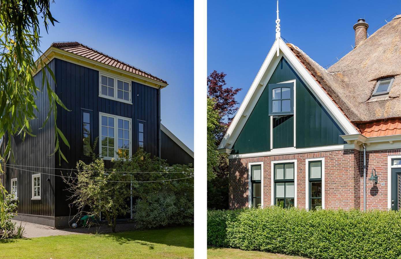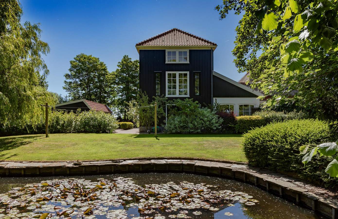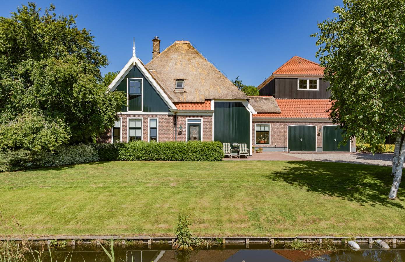 Aan de rustige Korte Bosweg, net buiten de bebouwde kom van ’t Zand, staat deze in 2002 traditioneel gebouwde stolpwoning met kapberg. De donkergroene houten geveldelen, grote boerderijramen en de imposante ronde schoorsteen vormen samen een tijdloos gevelbeeld. Het rieten dak – uitgerust met sprinklerinstallatie en bliksemafleider – legt een warme deken over de stolp. De kenmerkende kapberg herbergt een ruime slaapkamer met een badkamer en suite en prachtig uitzicht over het parkachtige perceel. Met een perceeloppervlakte van 2.545 m² beschikt u over een eigen domein van rust, ruimte en ultieme privacy.