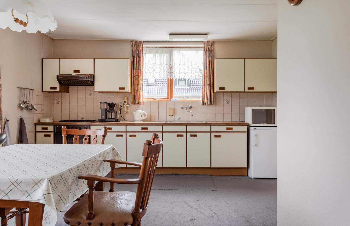 De keuken, gesitueerd aan de linker voorzijde van de boerderij, is eenvoudig qua uitvoering, maar is een knusse ruimte. Het is de plek waar u aan de eettafel kunt genieten van het landelijke uitzicht. Naast de keuken vindt u een praktische wasruimte en een apart toilet.