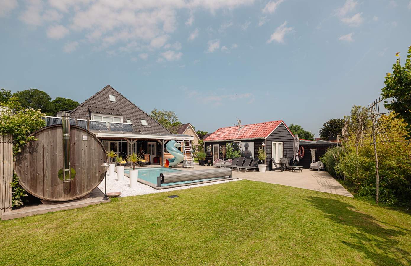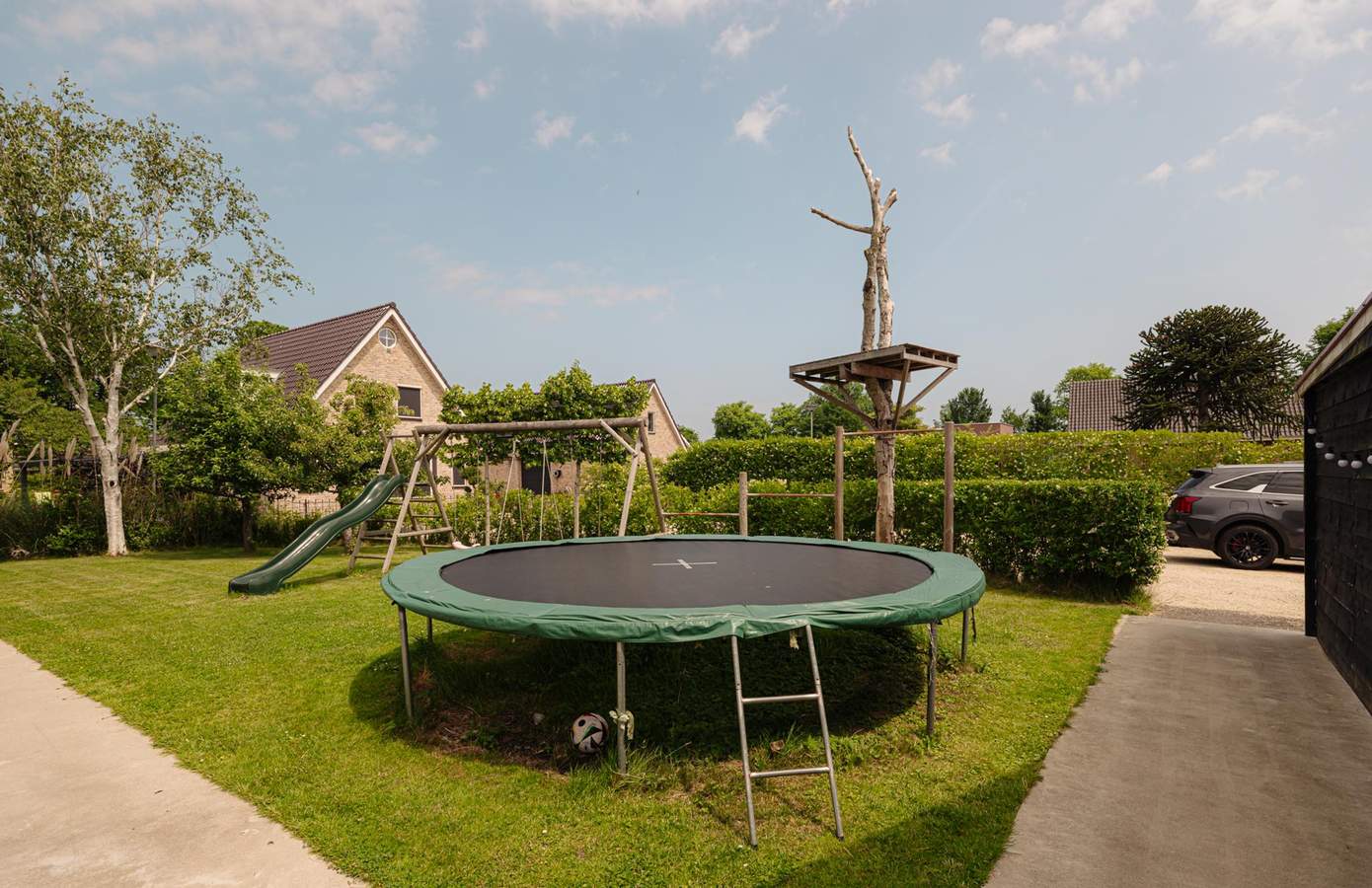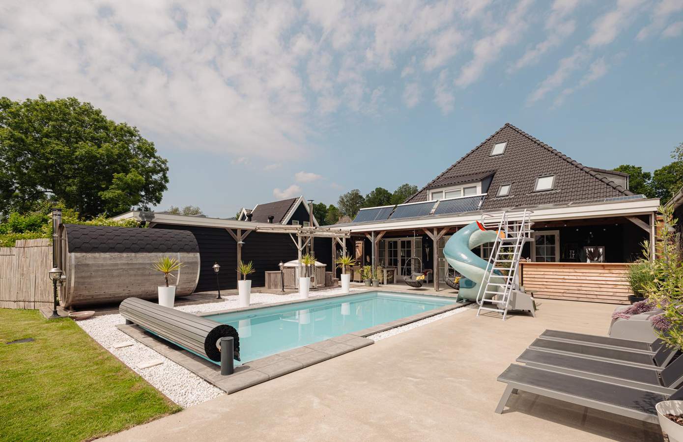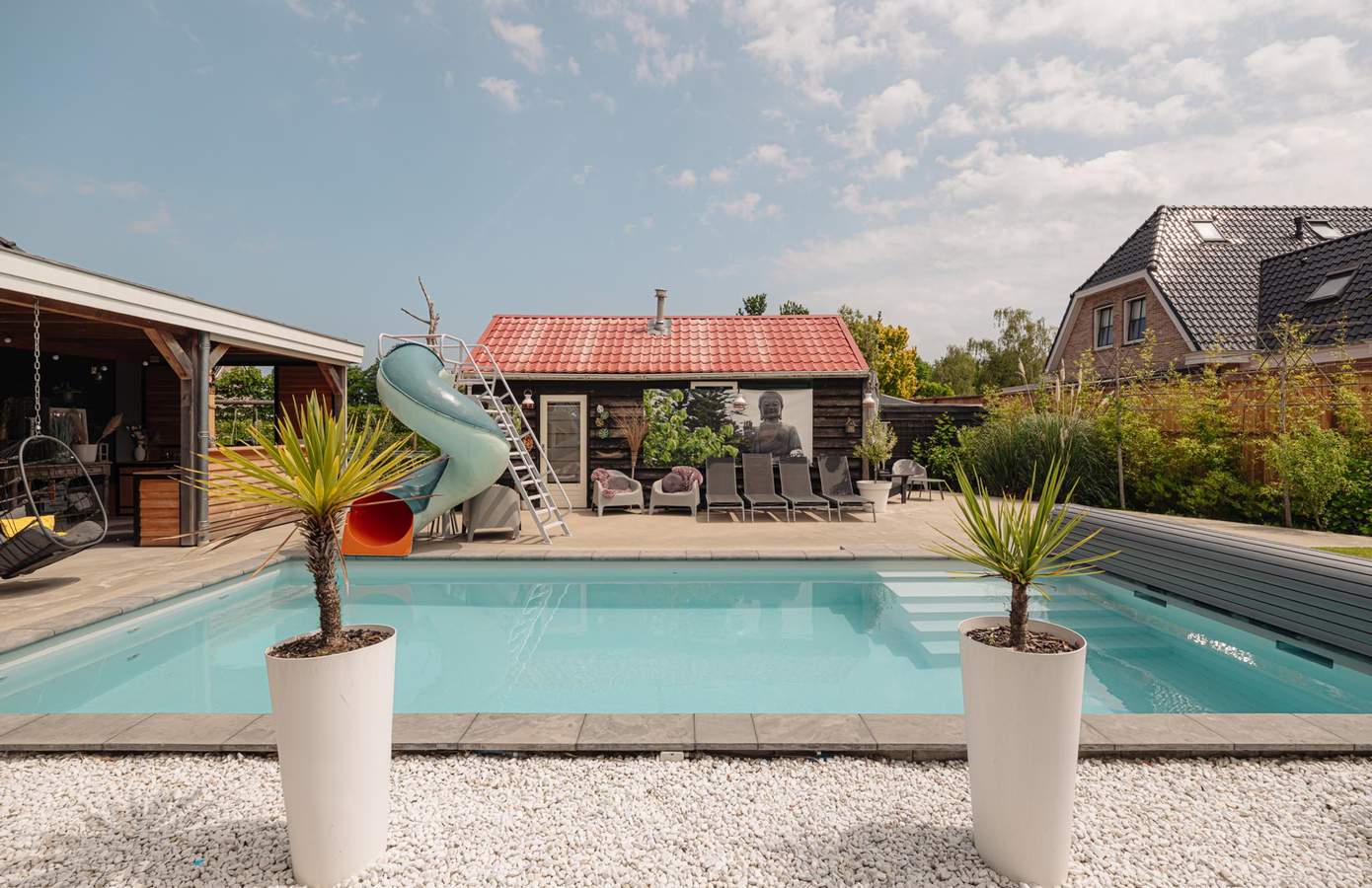 Het perceel van maar liefst 1.230 m² biedt een buitenruimte waar comfort, vermaak en privacy hand in hand gaan. Centraal in de tuin ligt het zwembad van 8,5 bij 4 meter met automatisch aquadeck, dat via de warmtepomp verwarmd en gekoeld kan worden. Het zwembad is uitgerust met een hydrolyse filtersysteem, waardoor het water altijd helder blijft. Direct daarnaast vind u een barrel sauna, een sfeervolle houtgestookte hottub en meerdere zonneterrassen. Alles is ingericht met oog voor kwaliteit en gebruiksgemak, zodat u op elk moment van de dag een plek vindt om te ontspannen of juist actief bezig te zijn. Onder de riante veranda met sfeerverlichting is het heerlijk tafelen aan een lange eettafel. De volledig uitgeruste buitenkeuken is een fantastische toevoeging aan het geheel. De tuin is verder ingericht met een combinatie van volwassen beplanting, fruitbomen en een strak gazon. Aan de zijkant van het perceel ligt een speelgedeelte met trampoline, schommel, glijbaan en zelfs een boomhut, de perfecte plek voor jonge avonturiers.