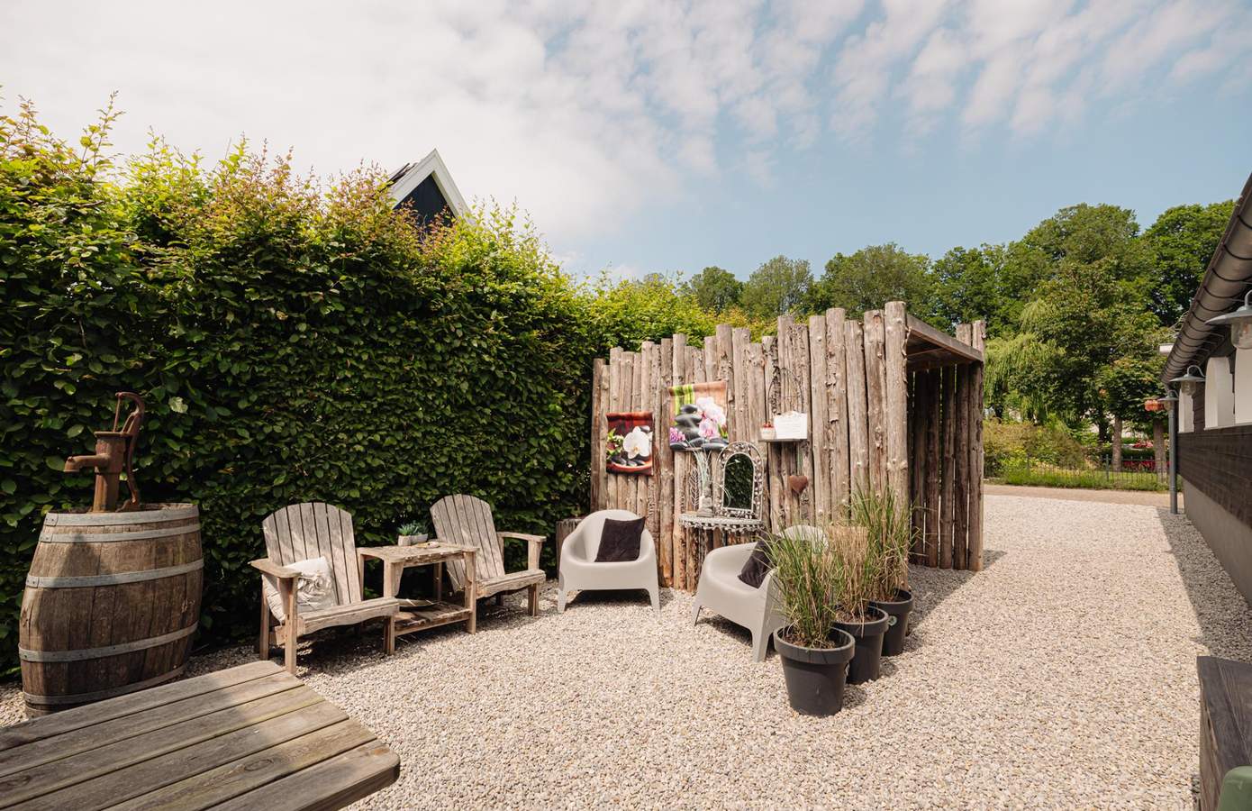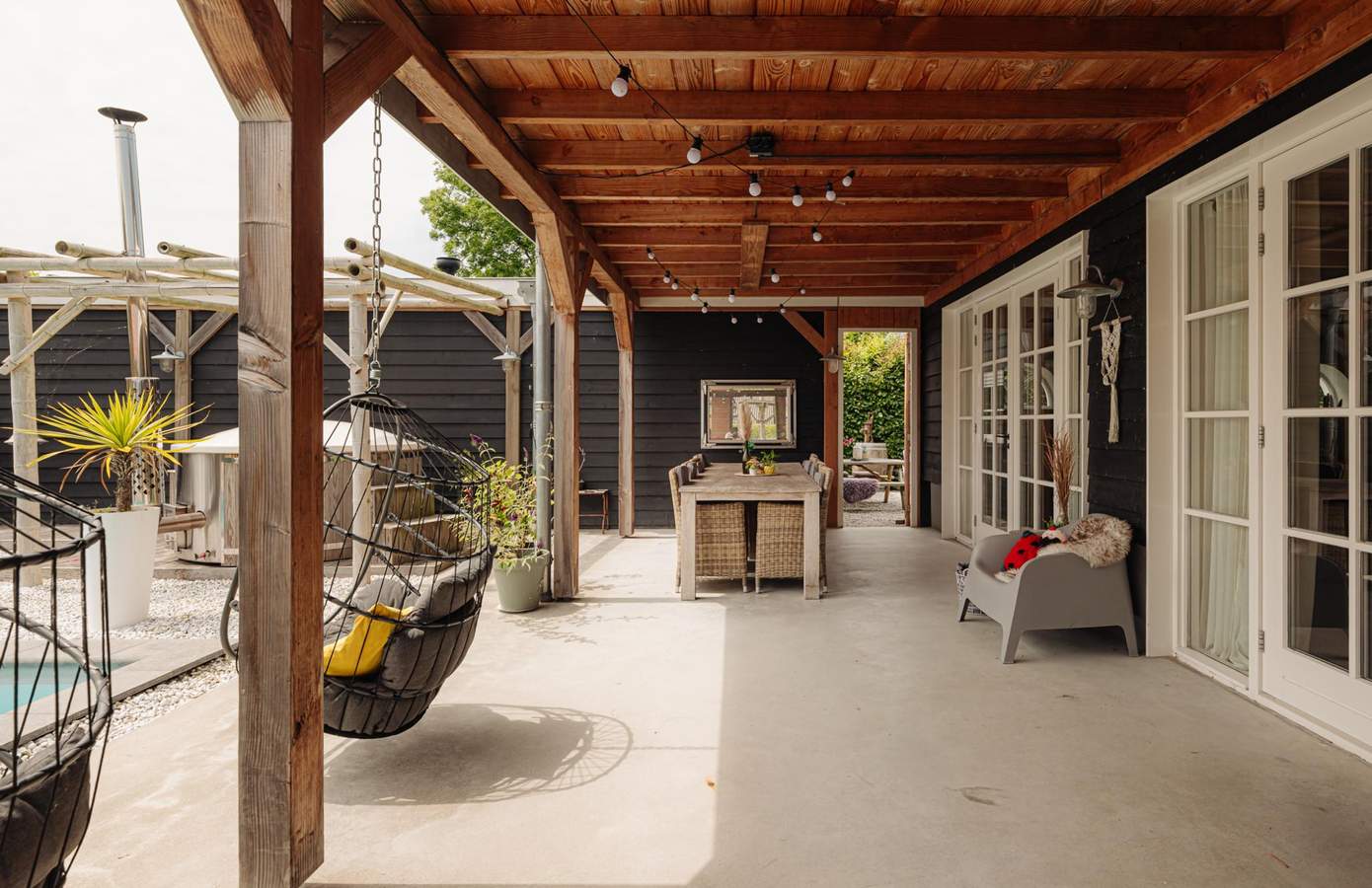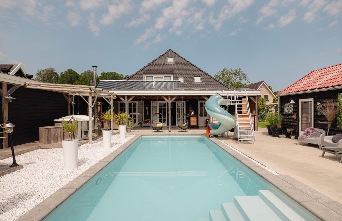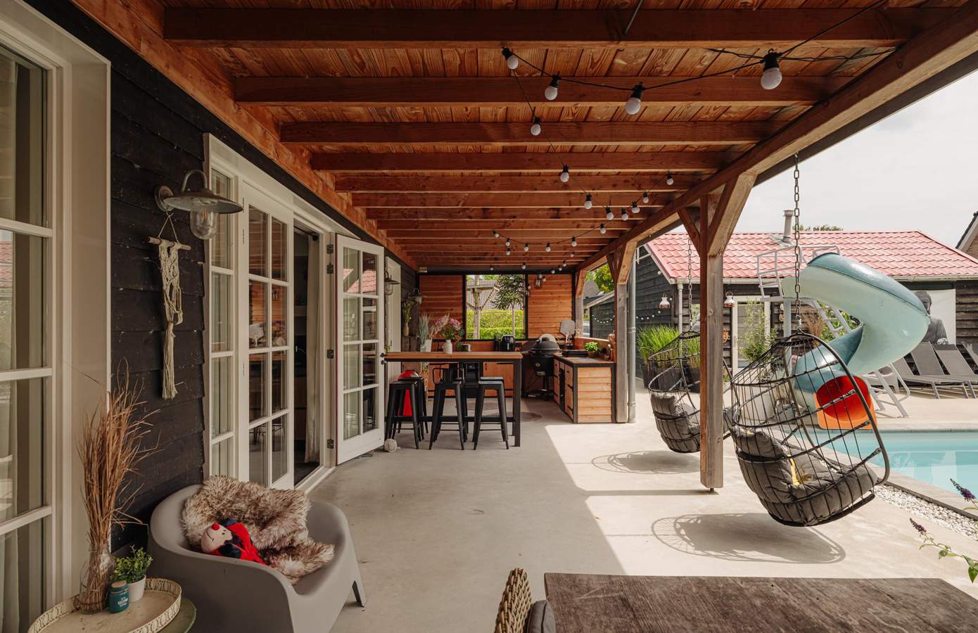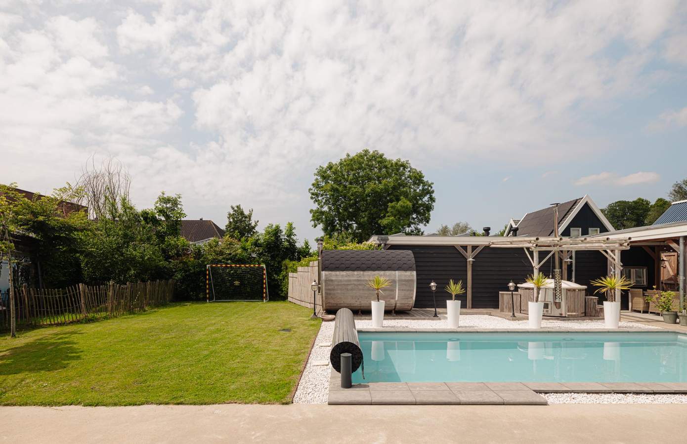 Het perceel van maar liefst 1.230 m² biedt een buitenruimte waar comfort, vermaak en privacy hand in hand gaan. Centraal in de tuin ligt het zwembad van 8,5 bij 4 meter met automatisch aquadeck, dat via de warmtepomp verwarmd en gekoeld kan worden. Het zwembad is uitgerust met een hydrolyse filtersysteem, waardoor het water altijd helder blijft. Direct daarnaast vind u een barrel sauna, een sfeervolle houtgestookte hottub en meerdere zonneterrassen. Alles is ingericht met oog voor kwaliteit en gebruiksgemak, zodat u op elk moment van de dag een plek vindt om te ontspannen of juist actief bezig te zijn. Onder de riante veranda met sfeerverlichting is het heerlijk tafelen aan een lange eettafel. De volledig uitgeruste buitenkeuken is een fantastische toevoeging aan het geheel. De tuin is verder ingericht met een combinatie van volwassen beplanting, fruitbomen en een strak gazon. Aan de zijkant van het perceel ligt een speelgedeelte met trampoline, schommel, glijbaan en zelfs een boomhut, de perfecte plek voor jonge avonturiers.