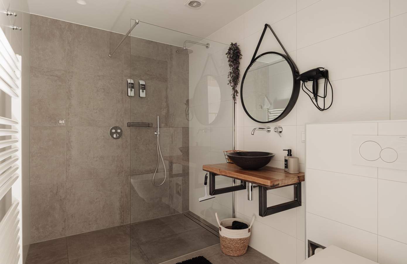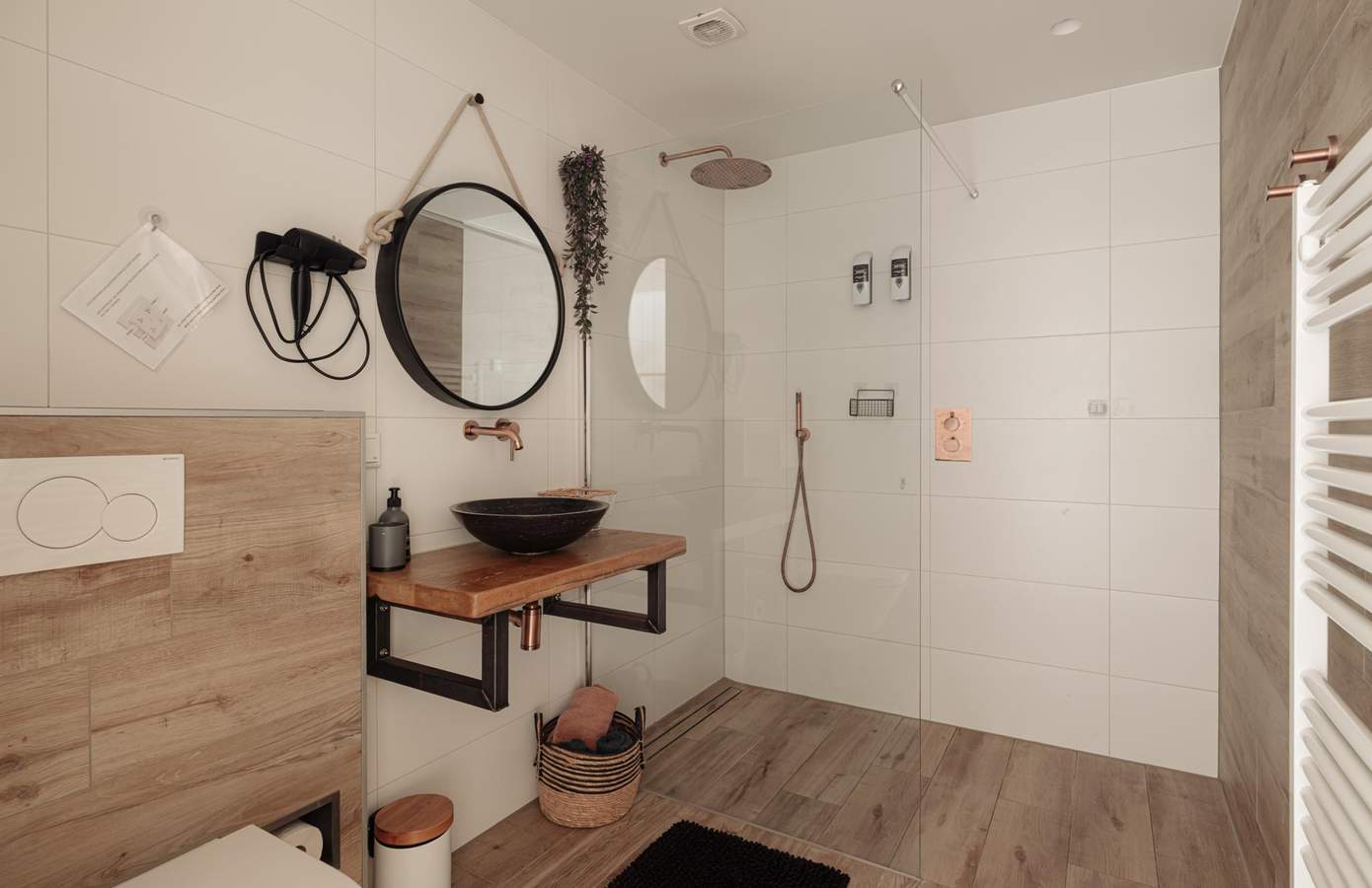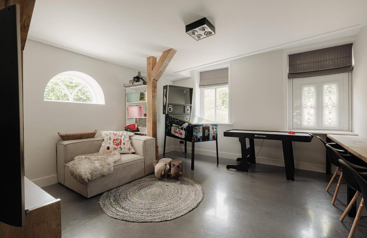 De eerste verdieping is ruim en biedt volop leefcomfort. Rondom de centrale overloop bevinden zich maar liefst vier slaapkamers en twee badkamers, elk met een doordachte indeling. De master bedroom is een ware suite met vrijstaand ligbad, luxe inloopdouche, dubbele wastafel en stijlvolle afwerking in warme tinten en natuurlijke materialen. Het zicht op de originele balken zorgt voor een fijne balans tussen modern en karaktervol. Ook de overige slaapkamers zijn stuk voor stuk sfeervol ingericht, met dakramen, originele houten elementen en speelse indelingen die perfect passen bij het karakter van de stolp. De tweede badkamer is modern uitgevoerd met inloopdouche, wastafelmeubel en toilet. De combinatie van betonlook tegels, houten accenten en glas zorgt ook hier voor een luxe hotelsfeer. Via een vaste trap bereikt u de tweede verdieping, waar een verrassend lichte en multifunctionele ruimte is gecreëerd. De combinatie van het dakraam, mooie vloerafwerking en de glazen balustrade zorgt voor een moderne uitstraling met behoud van karakter.