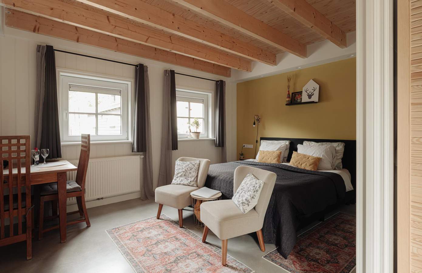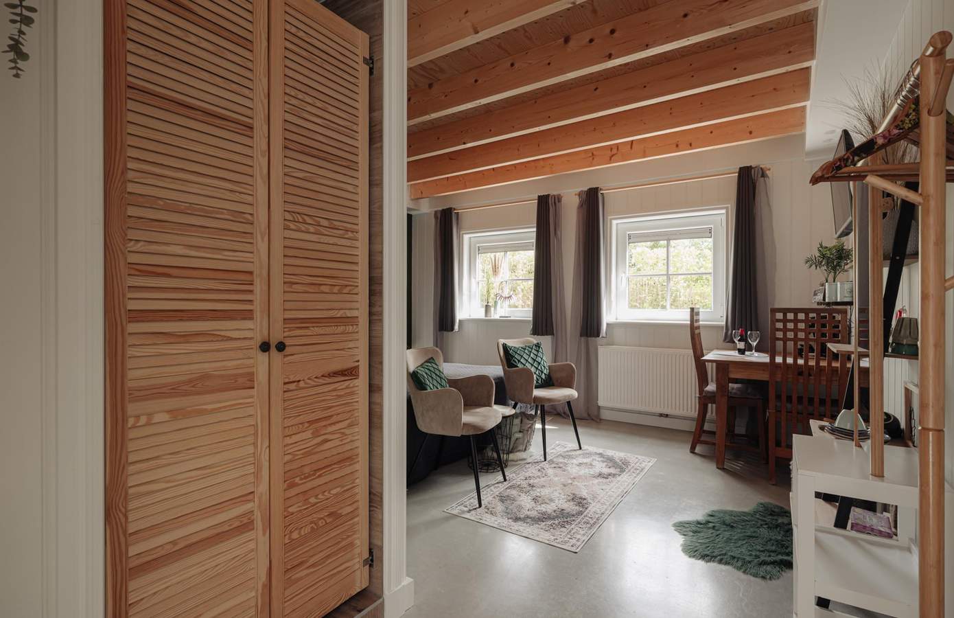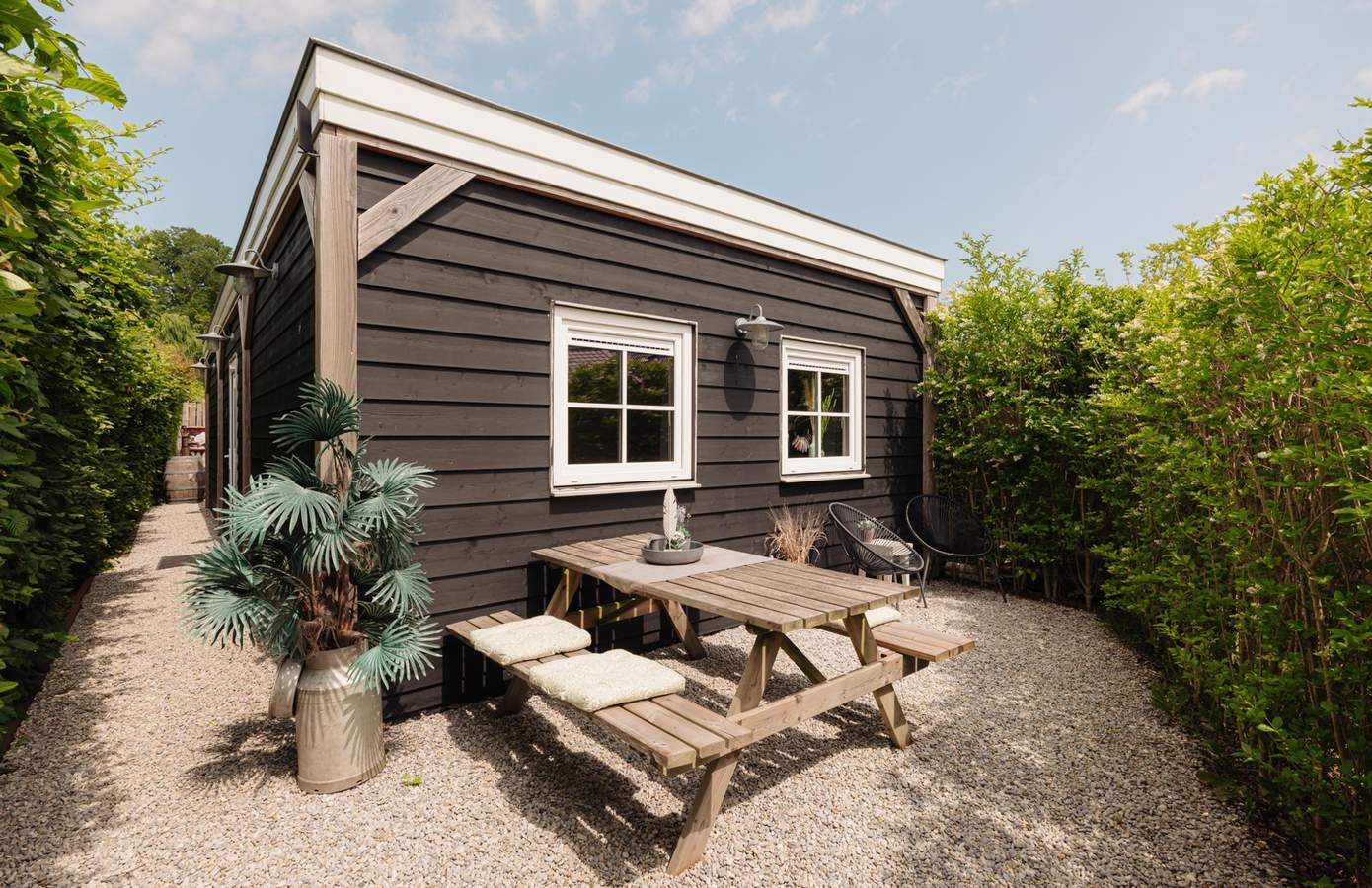 Schuin achter de stolp staat het bijgebouw, gebouwd in 2019. Het bijgebouw beschikt over twee volwaardige identieke kamers, elk met eigen sanitair, een sfeervolle inrichting en een privéterras.