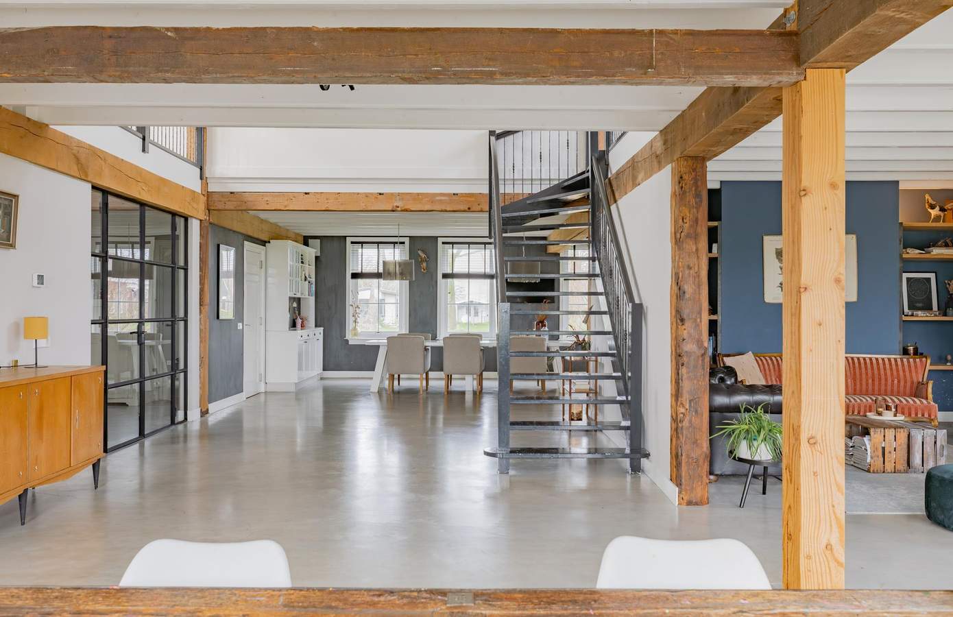 Via de trap bereikt u de verdieping, waar de imposante vide direct de aandacht trekt. De hoogte, de zichtbare houten spanten en het overvloedige daglicht zorgen hier voor een indrukwekkend ruimtelijk gevoel, versterkt door de zes Velux Combi hellende dakramen.