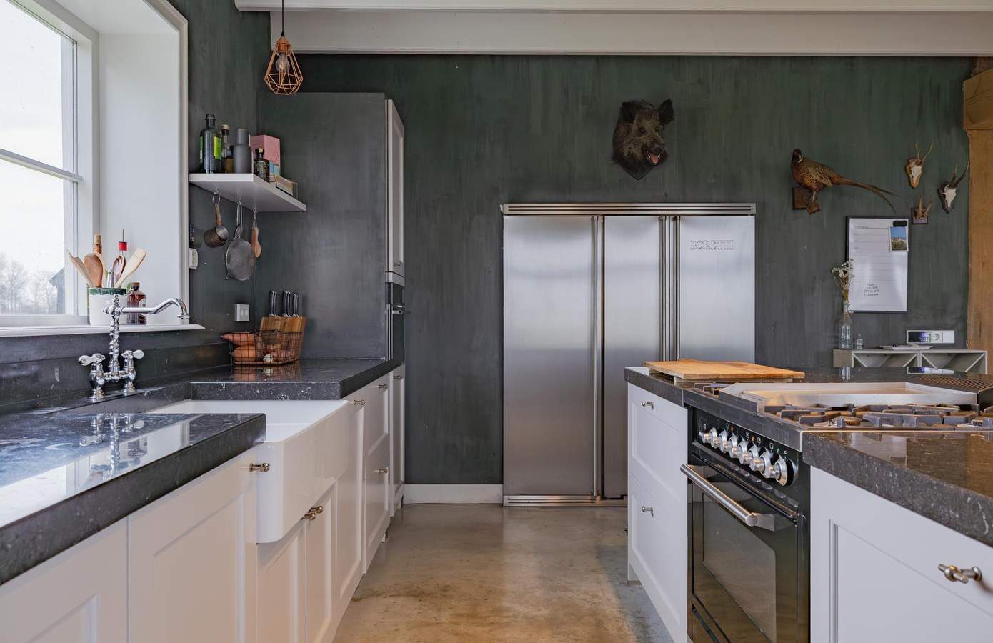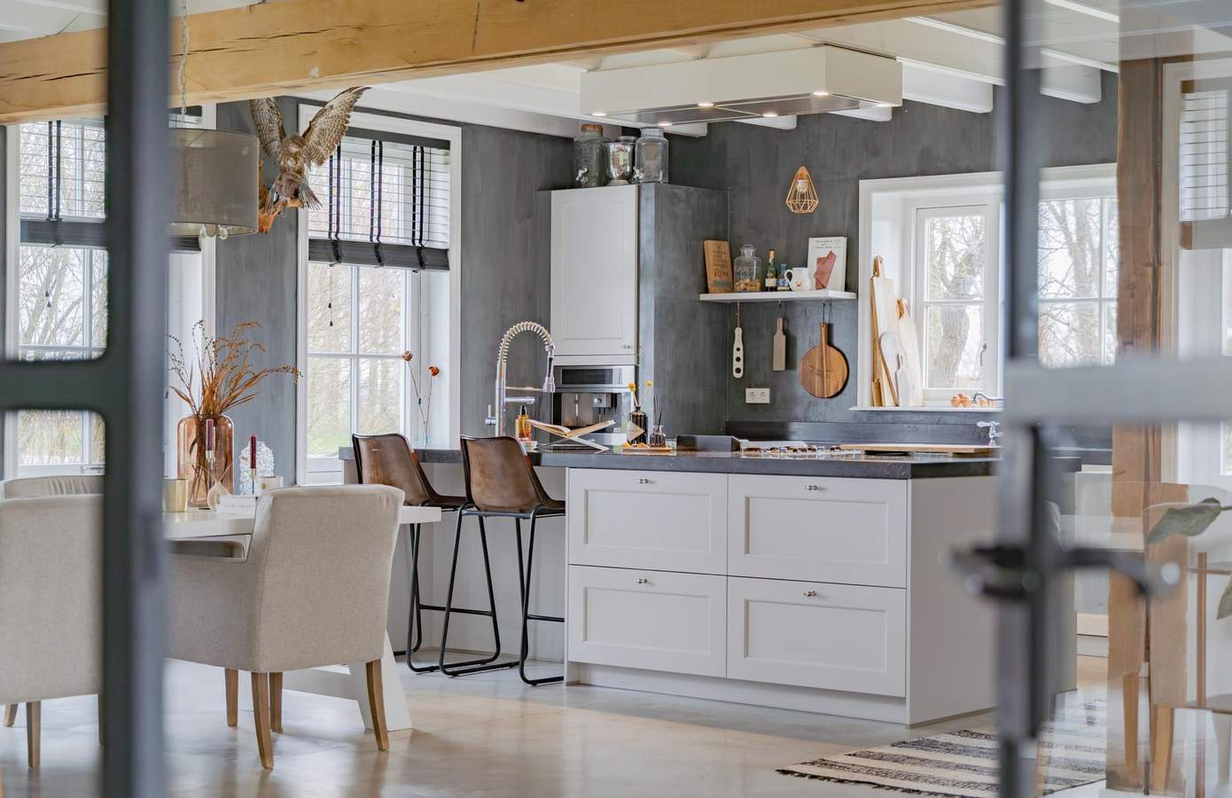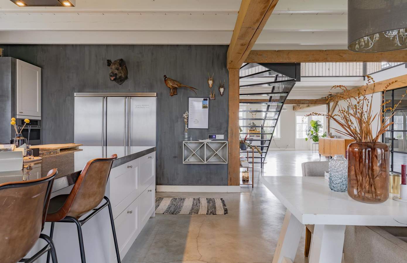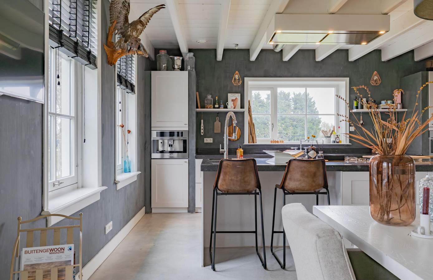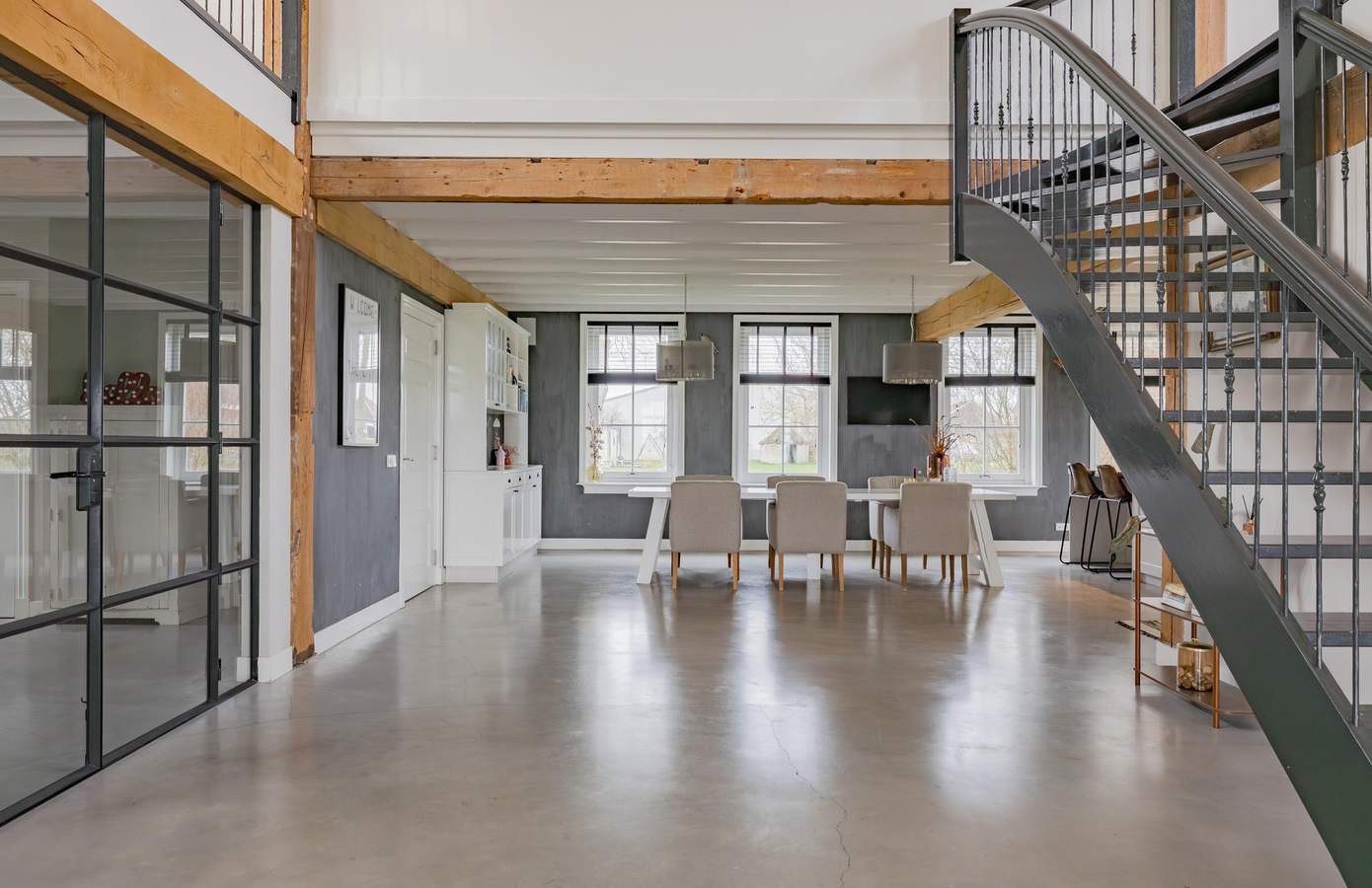 In de woonkamer ziet u hoe ruimte en intimiteit elkaar versterken. Door het creëren van verschillende leefhoeken oogt de ruimte indrukwekkend groot, terwijl het overal even knus en sfeervol aanvoelt. Denk aan de comfortabele zithoek rond de haard, een royale tv-plek en zichtlijnen die doorlopen naar de tuin. Dankzij de meerdere dubbele tuindeuren haalt u buiten moeiteloos naar binnen. De gevlinderde betonvloer met vloerverwarming, de Frans eiken balken, het strakke stucwerk en de houtkachel vormen samen een rustige, natuurlijke basis die perfect past bij het karakter van de woonboerderij.
