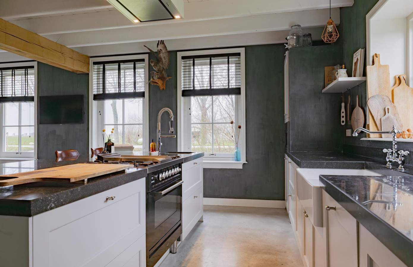 De openkeuken is echt maatwerk, ontworpen door TKI. Het Belgisch hardstenen werkblad springt direct in het oog. U beschikt hier over hoogwaardige inbouwapparatuur zoals een wijnkoelkast, Boretti fornuis en een Amerikaanse koelkast. Alles is gericht op gemak, kwaliteit en genieten. De aangrenzende bijkeuken met wasopstelling biedt extra functionaliteit, praktisch en uit het zicht.