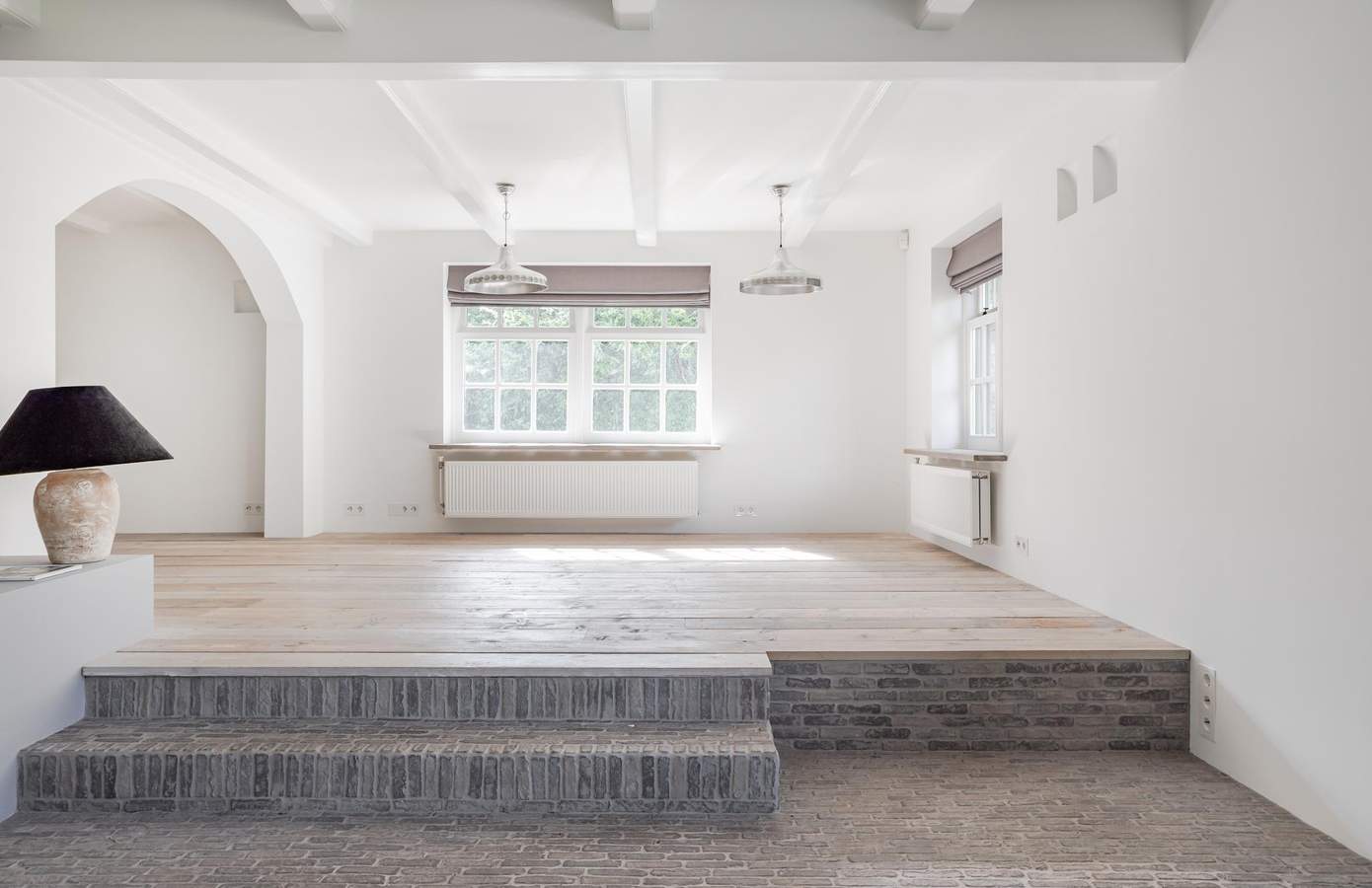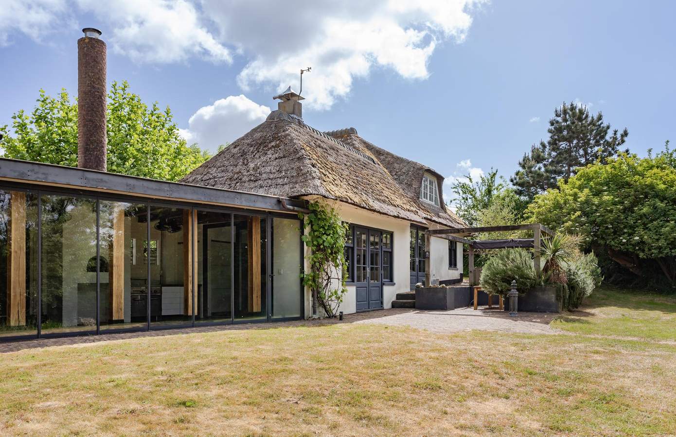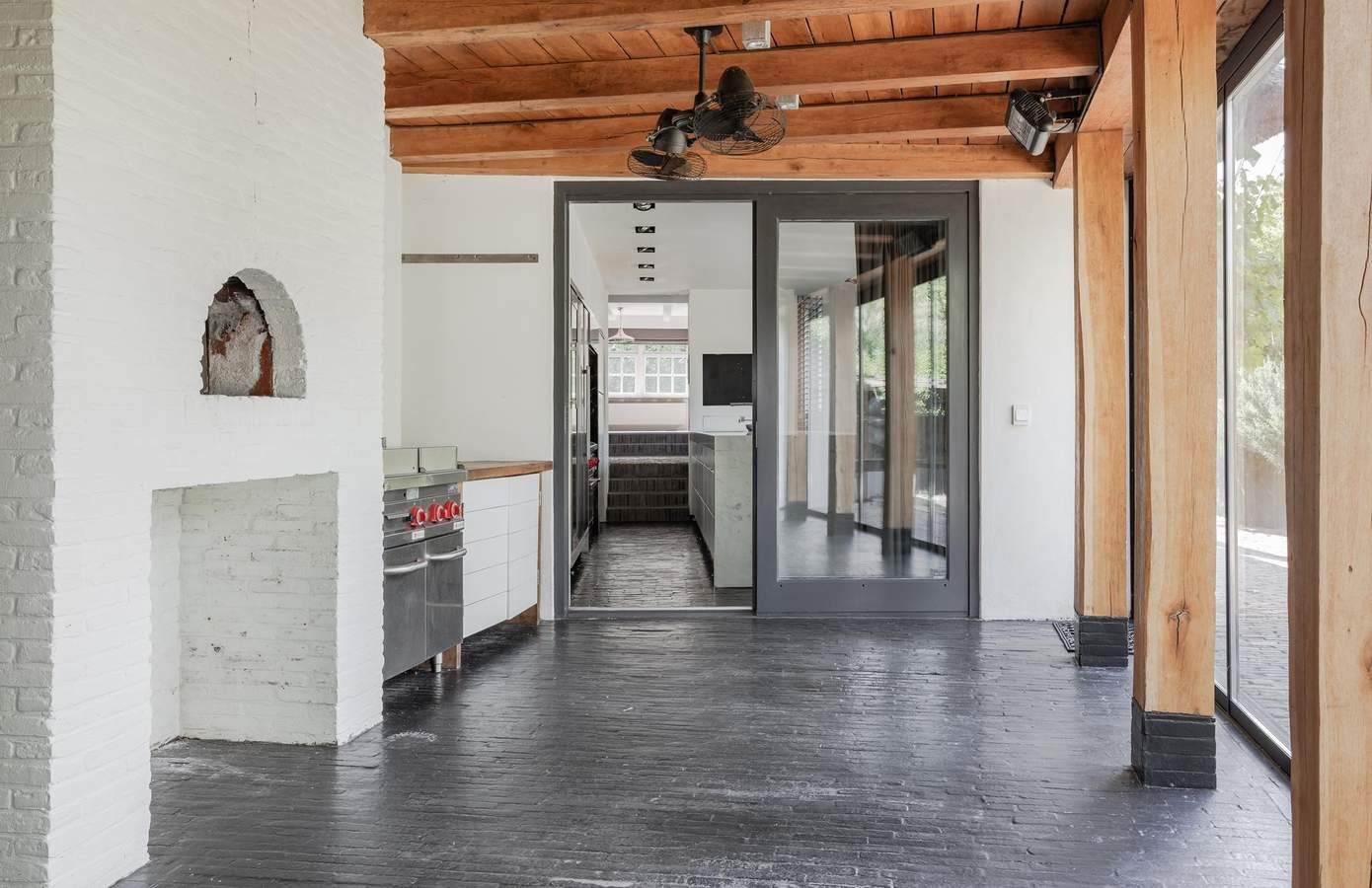 Vanuit de keuken betreedt u de aangebouwde serre. Dankzij een glazen wand kunt u hier het hele jaar door van genieten. De serre is uitgerust met een authentieke pizzaoven en een extra professioneel horeca-keukenmeubel, waardoor deze ruimte ideaal is voor uitgebreide diners met vrienden en familie. In de zomer kan de glazen wand volledig worden geopend, waardoor binnen en buiten naadloos in elkaar overlopen. Bovendien fungeert deze ruimte als verbinding tussen het woonhuis en het gastenverblijf.
