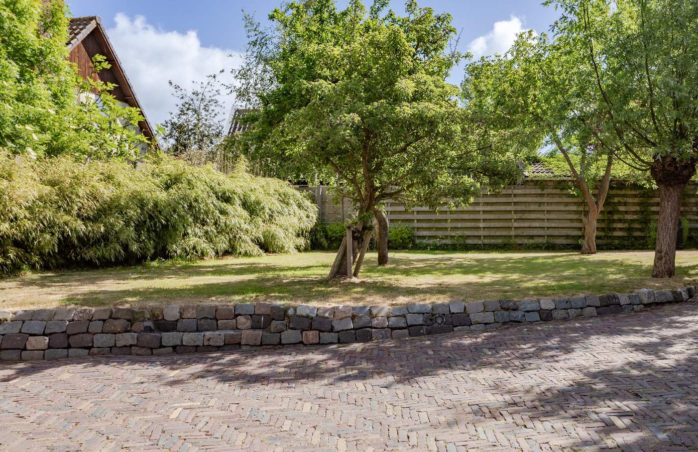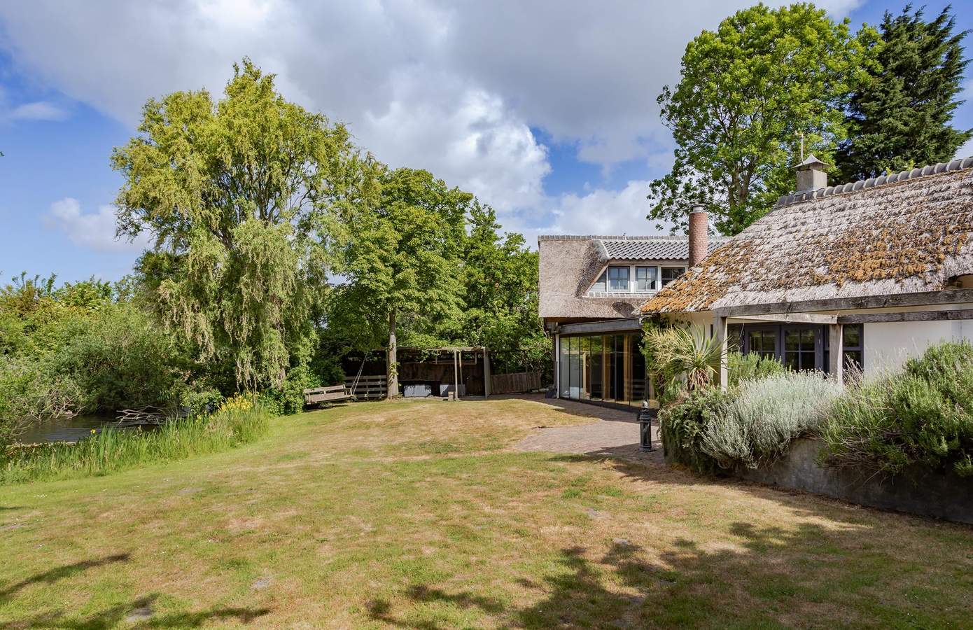 De achtertuin grenst aan een uitgestrekte waterpartij en wordt omringd door groen. Volwassen bomen zorgen hier voor een weelderig, groen paradijs. Op een van de terrassen zijn meerdere plekken gecreëerd om een zithoek in te richten. Daarnaast is er een houten overkapping met opbergruimte. Deze tuin biedt talloze mogelijkheden, maar is bovenal een plek waar u in alle privacy van het buitenleven kunt geniet