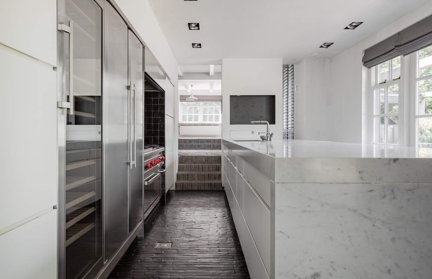 Het pronkstuk van de keuken is het royale kookeiland van maar liefst vijf meter lang, dat zich uitstekend leent voor gezellige diners aan de tegenoverliggende zijde. Bovendien is de keuken uitgerust met een professioneel horeca-keukenmeubel, voorzien van een uitgebreide uitrusting, waaronder een grote oven, twee gaspitten, een teppanyaki-plaat en een kookplaat met geïntegreerde wokbrander. Langs deze wand vindt u tevens een dubbele koelkast en een wijnkoelkast.
