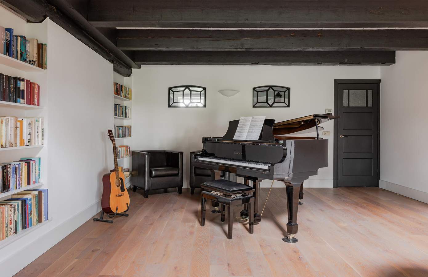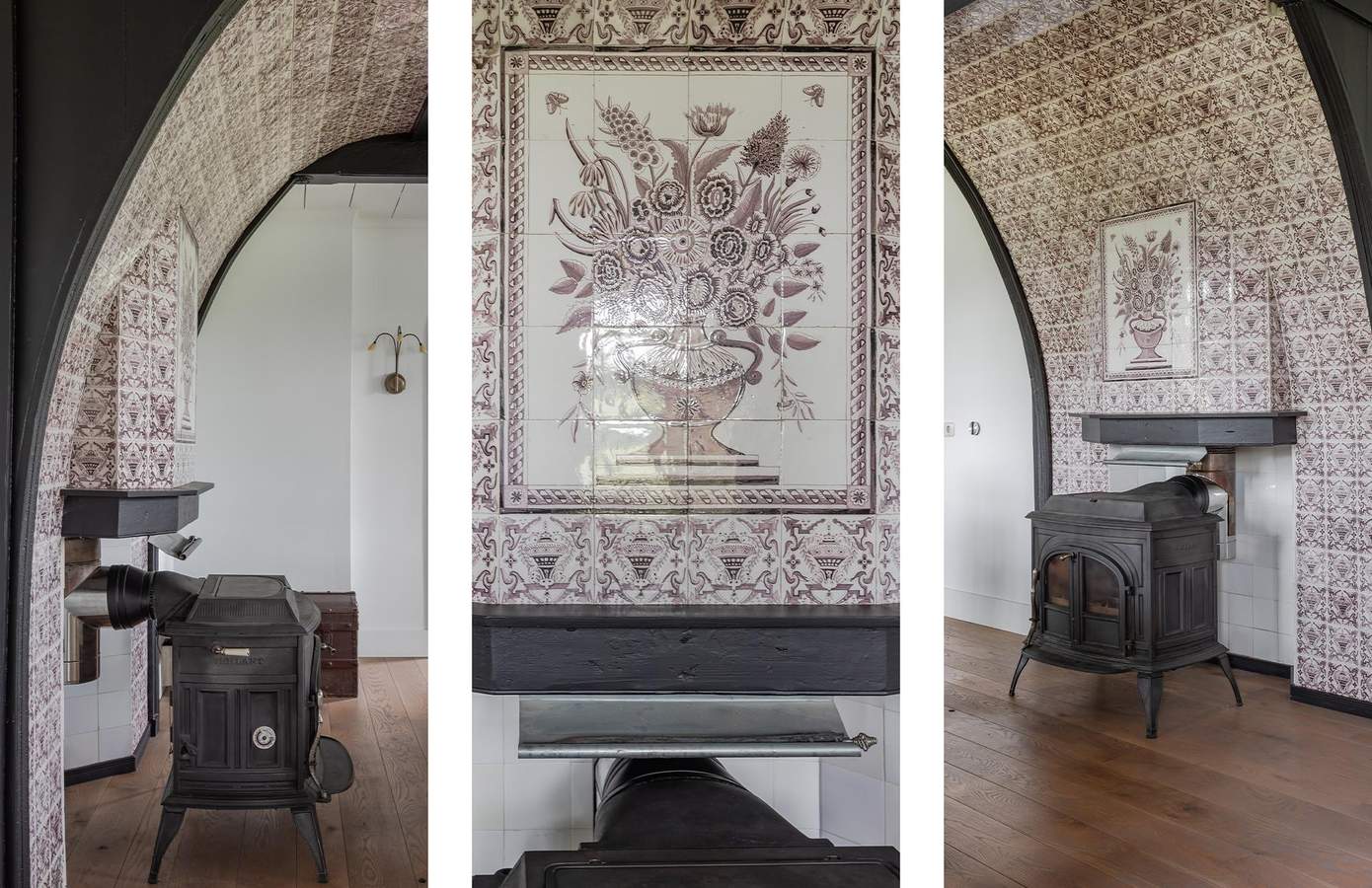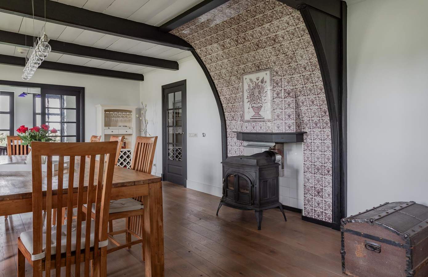 Bij binnenkomst via de hal ontdekt u meteen de charme van de boerderij. Bij de garderobekast is gebruik gemaakt van de originele bedsteedeuren. Rechts bevindt zich de voormalige ‘opkamer’ met een smuiger voorzien van originele tegels en een houtkachel, een echte eyecatcher! Aangrenzend bevindt zich de studeerkamer.