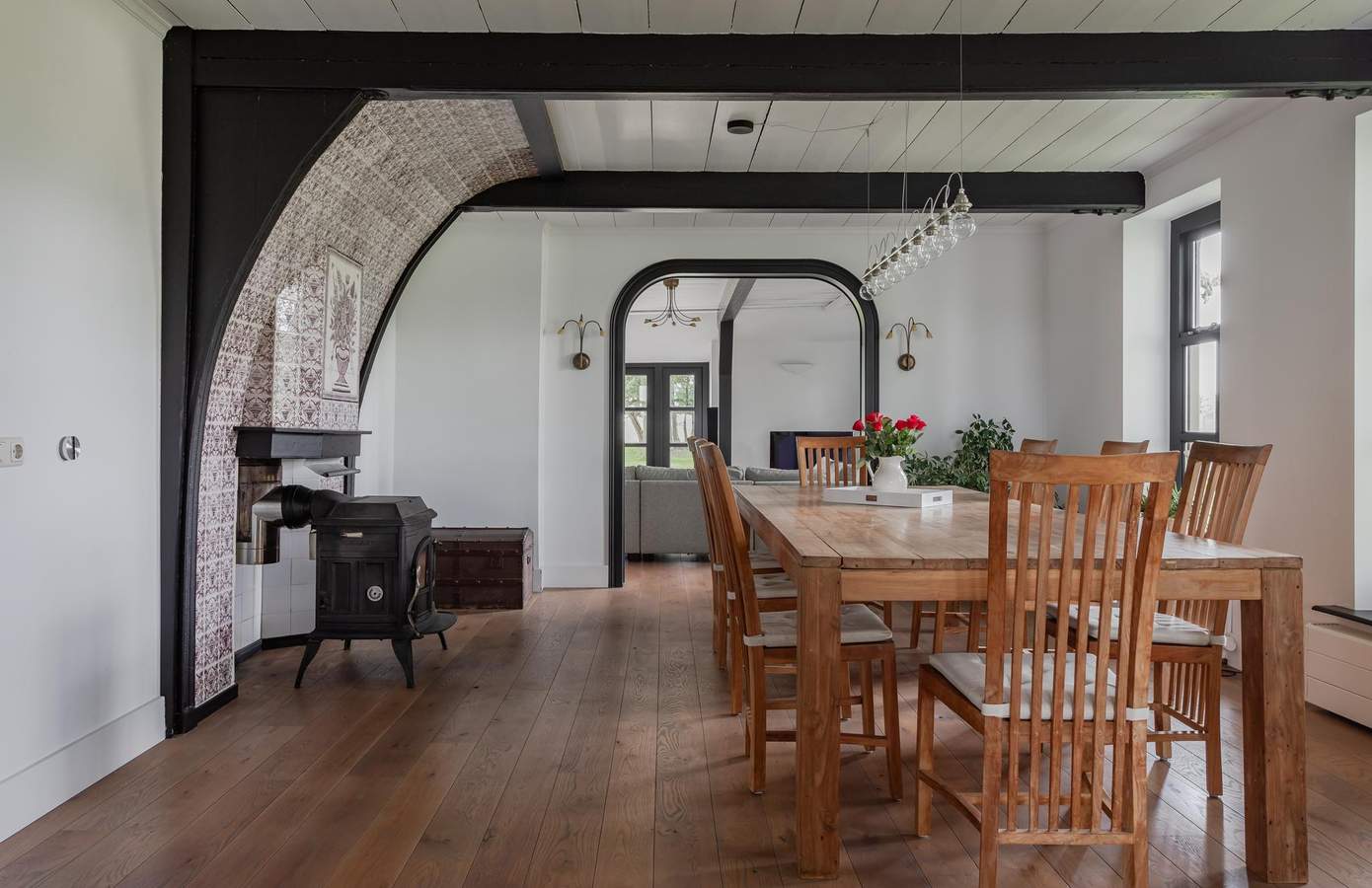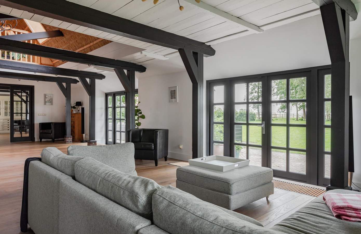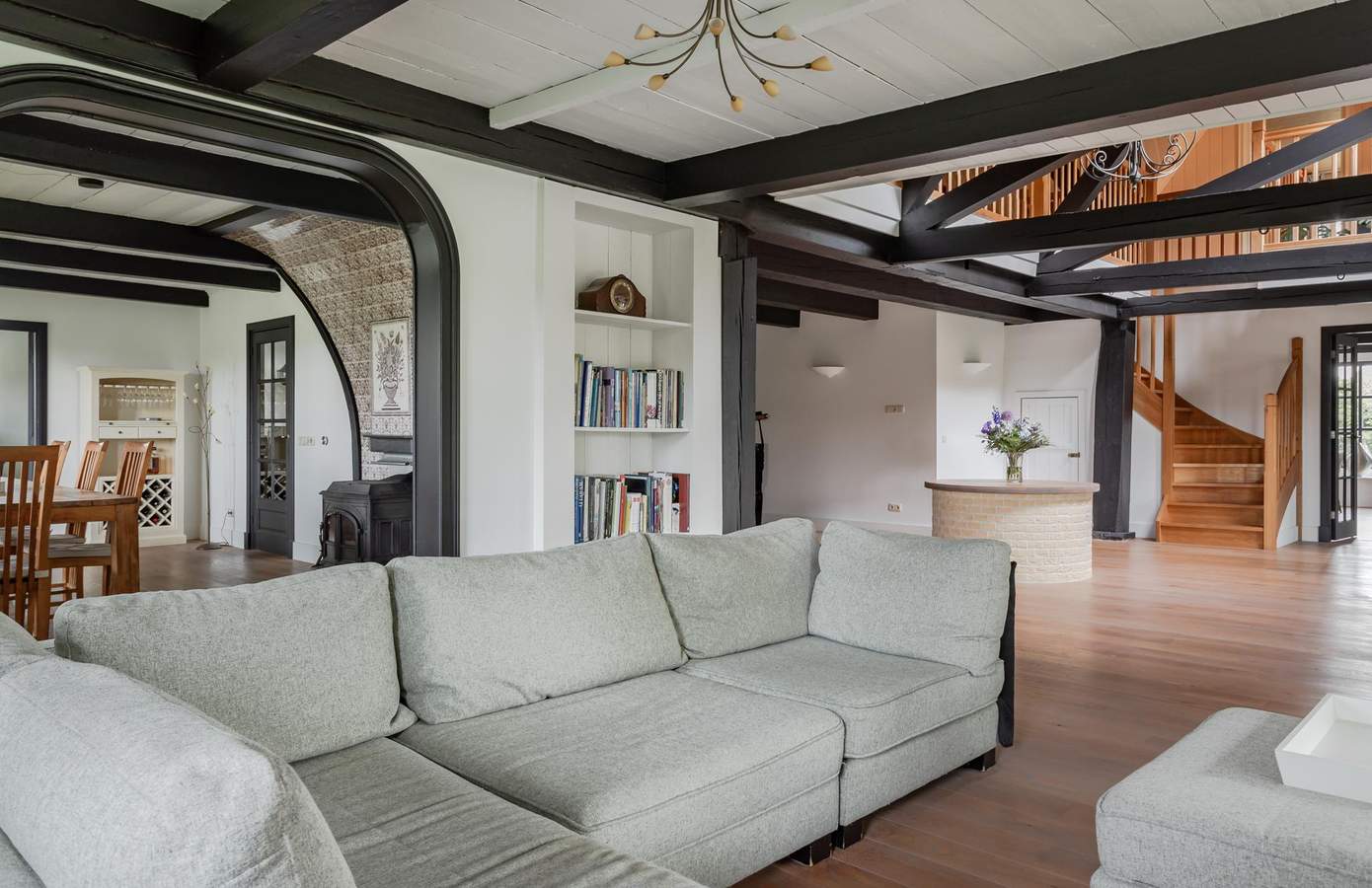 De voormalige stal is omgebouwd tot een indrukwekkende woonkamer met twee keer dubbele openslaande deuren naar de tuin. Het open ontwerp met dakramen zorgt voor een overvloed aan natuurlijk licht, dat het prachtige vierkant verlicht. In het midden van de woonkamer treft u de oude waterput, een uniek detail, stijlvol afgewerkt met nieuwe stenen en goed afgedicht van binnen.