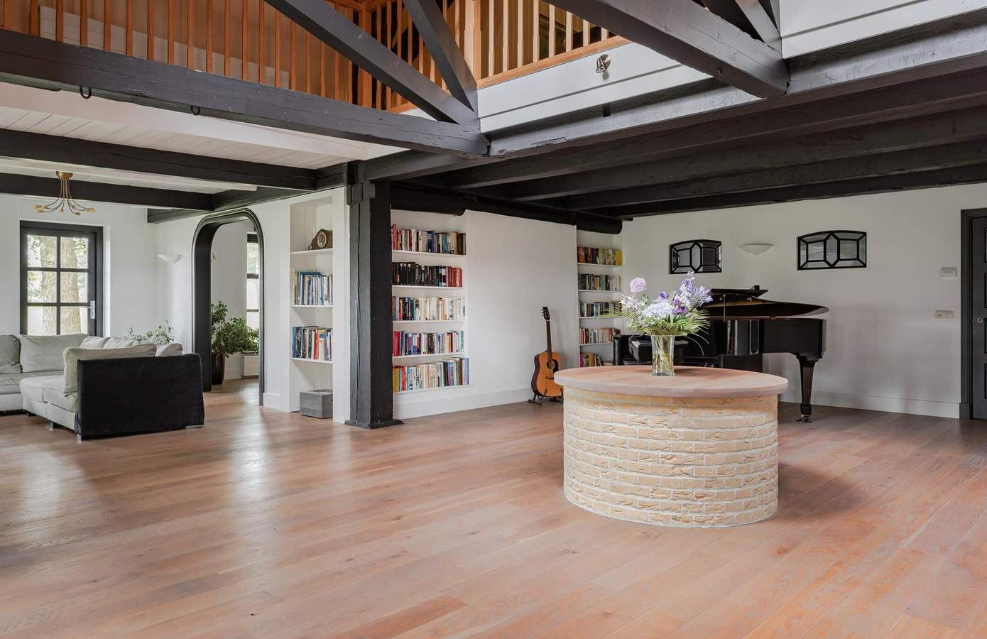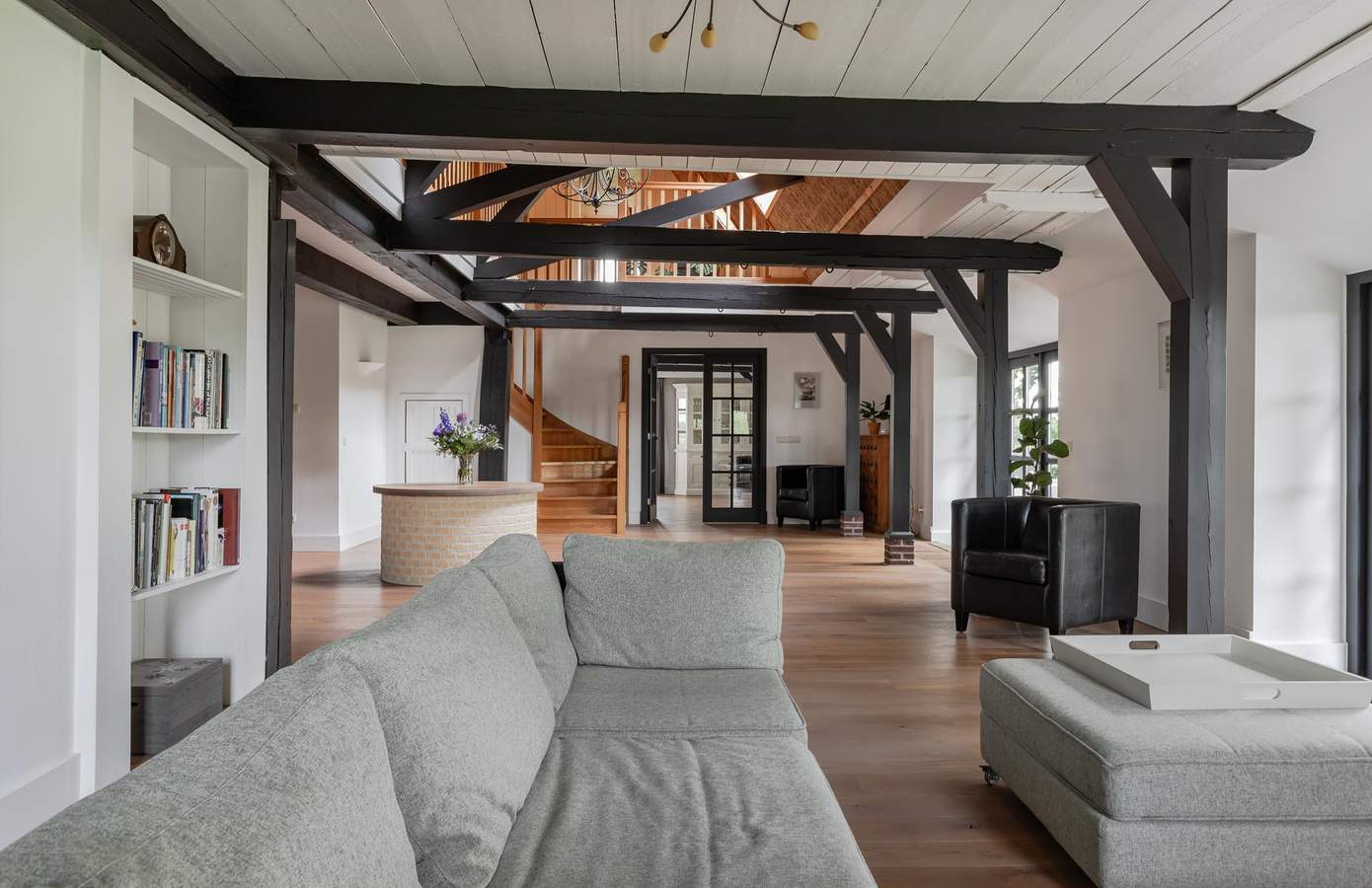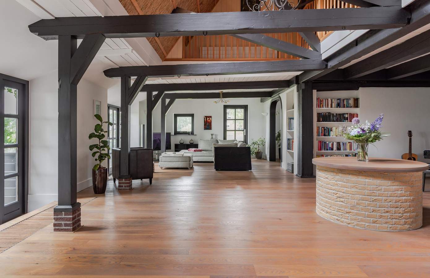 De begane grond beschikt over een slaapkamer en een badkamer, ideaal voor gelijkvloers wonen. De eerste verdieping verrast met een royale overloop, extra verstevigd voor de imposante snookertafel. De vierkantspalen zijn ook hier prachtig zichtbaar. Er zijn in totaal drie slaapkamers en twee badkamers op de verdieping. Een inloopkast biedt toegang tot een royale en-suite badkamer met 2-persoons bubbelbad, wastafel, toilet en regendouche. Chique Belgisch leisteen op de vloer en geglazuurde crème-kleurige tegels creëren een luxueuze uitstraling. De master bedroom grenst direct aan deze badkamer.