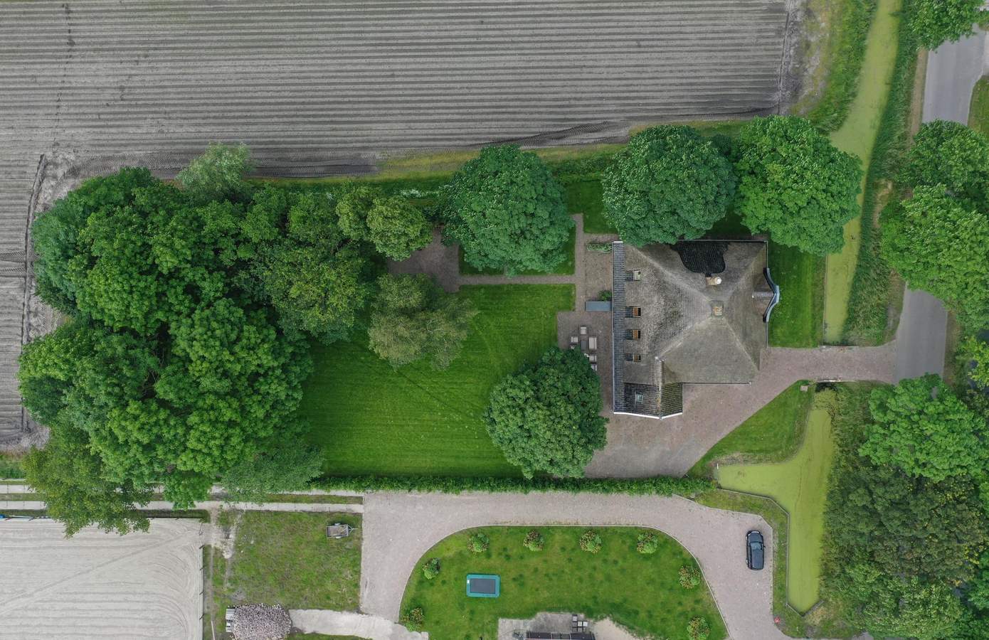 Het erf biedt parkeergelegenheid voor vier auto’s en beschikt over een laadpaal voor een elektrische auto, met voorbereidingen voor een tweede laadpaal al aanwezig.