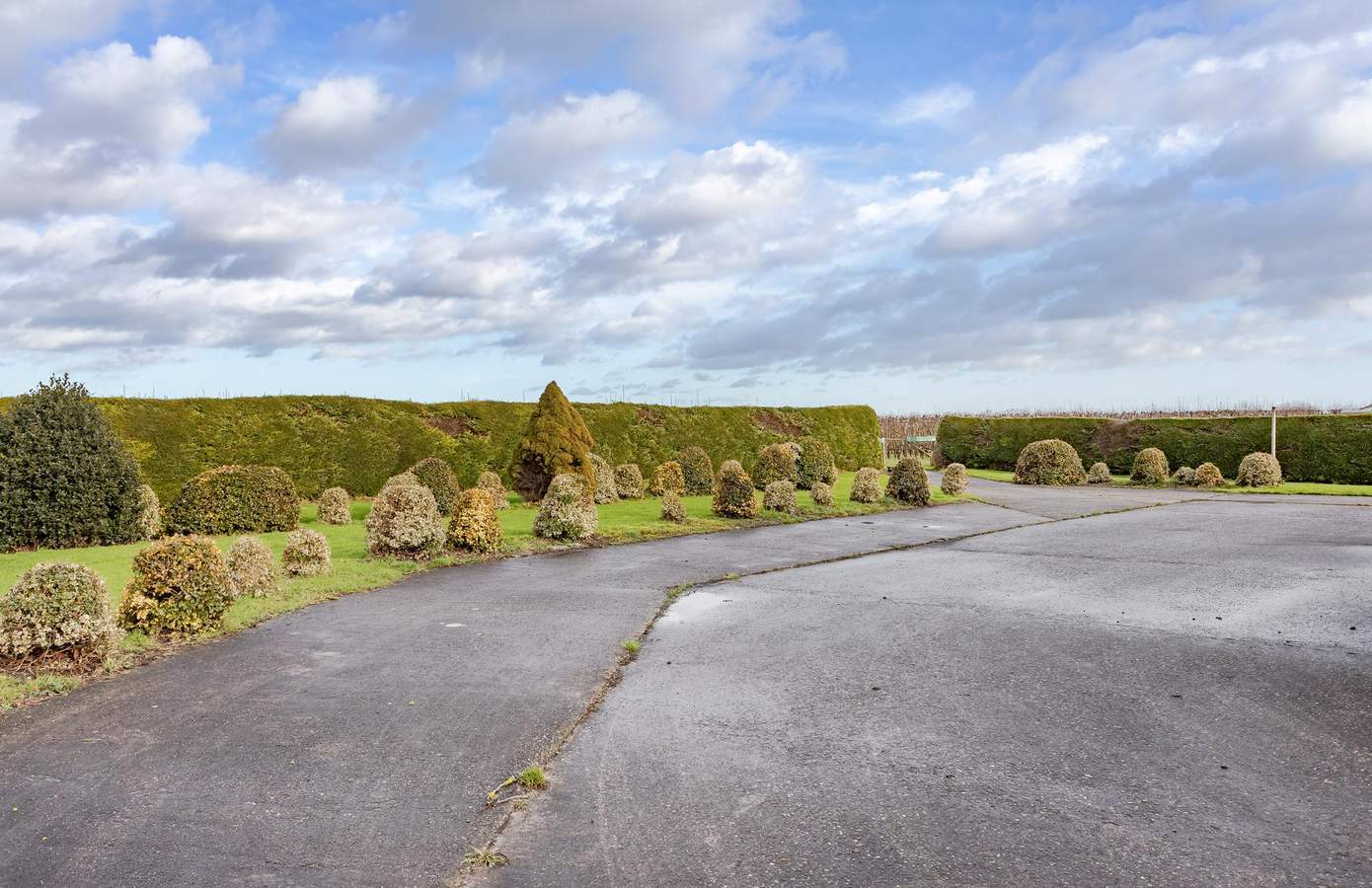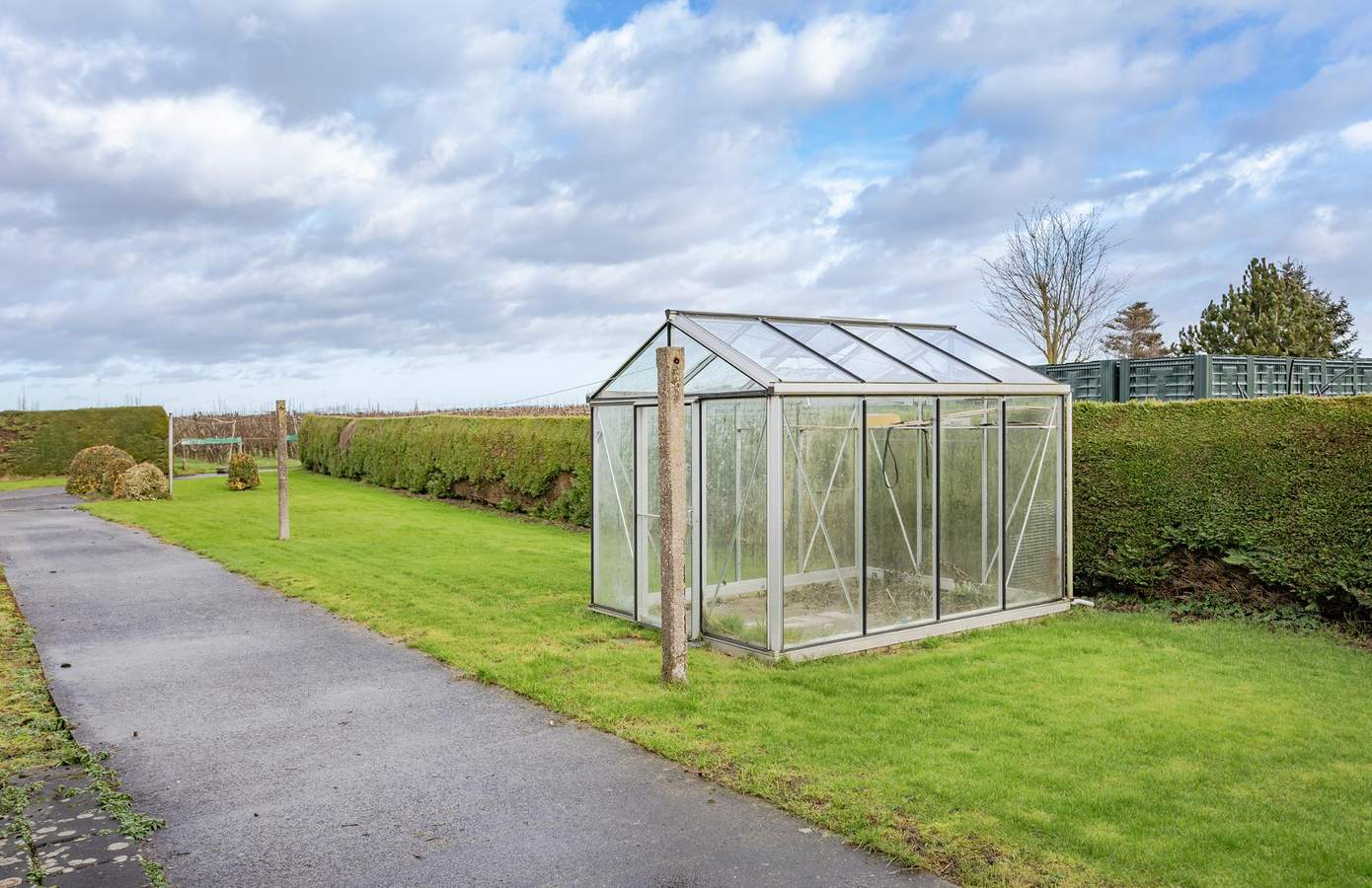 Een heerlijke tuin rondom met veel gras, verschillende bomen en een kas. Rondom de schuren liggen er betonverharding, waardoor het makkelijk is om achterom te komen met de auto. Meerdere auto’s kunnen hier parkeren.