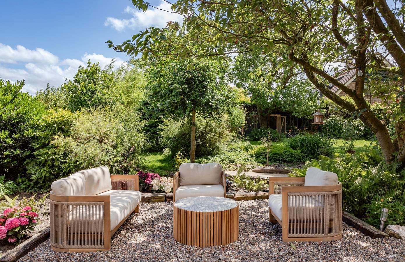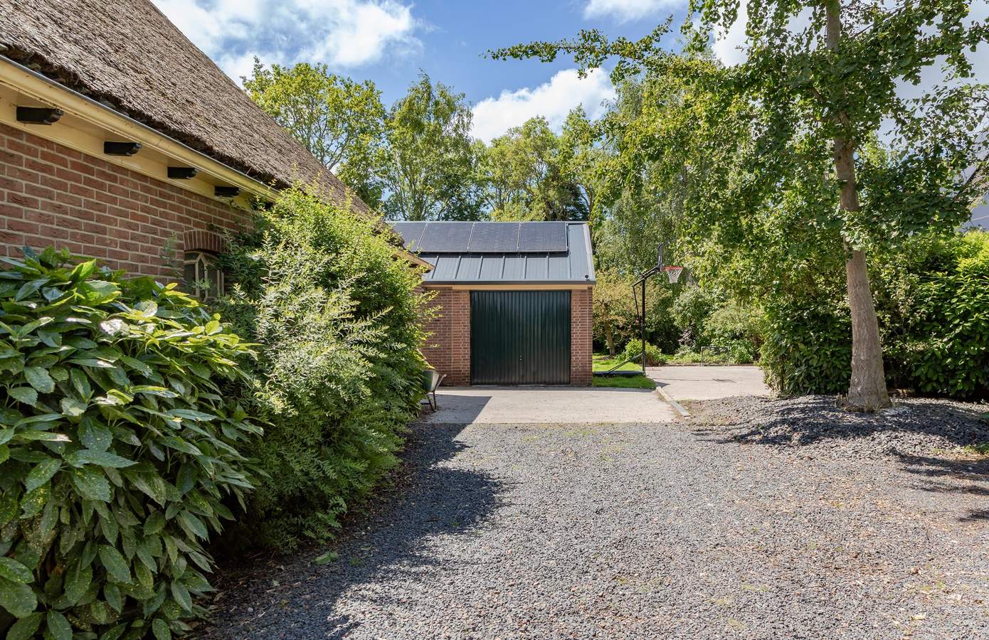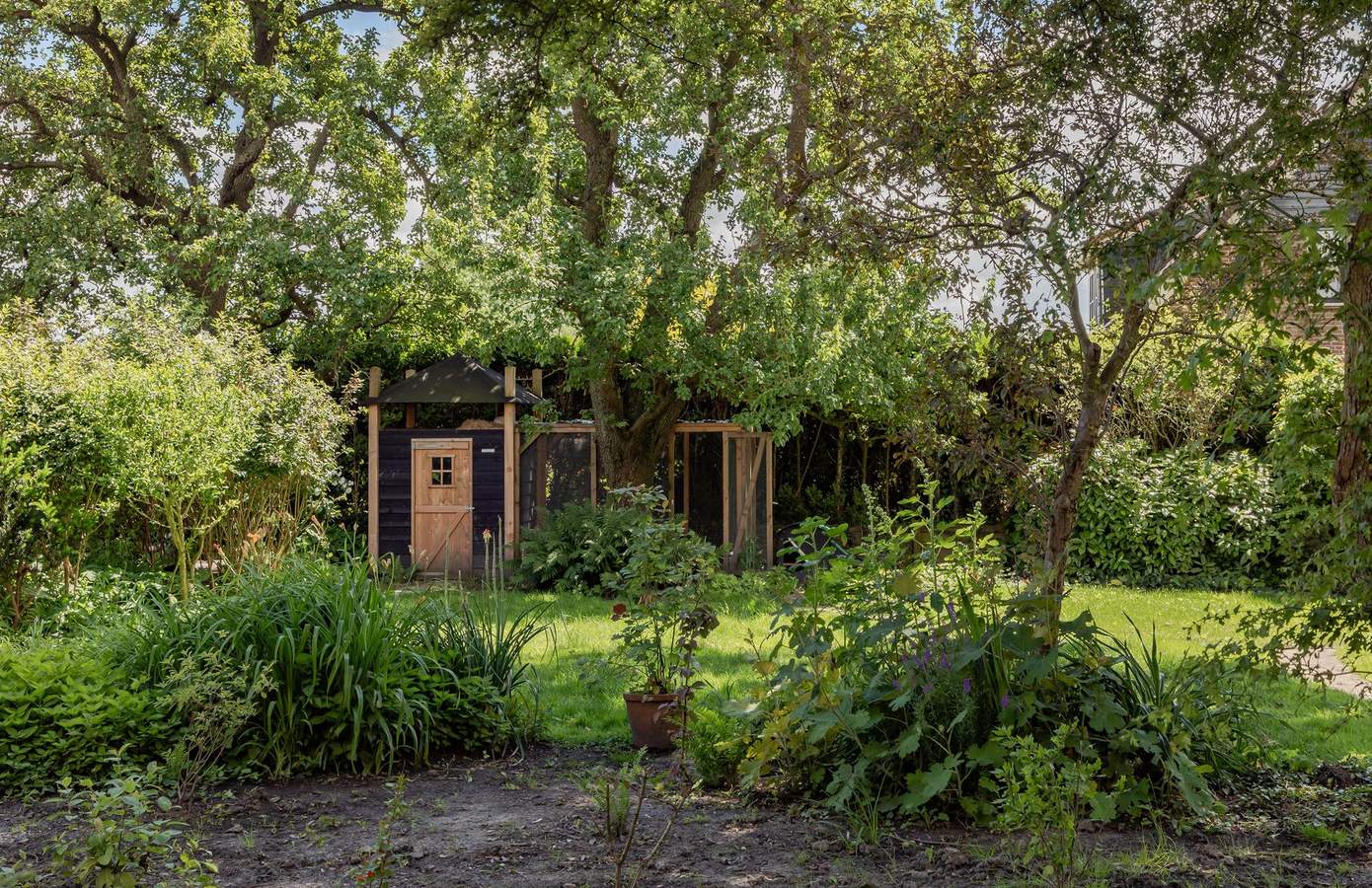 Alleen de tuin zou al een reden zijn om hier te gaan wonen. Kippen, konijnen en honden. Alles loopt er nu rond. Verschillende terrassen nodigen u uit om heerlijk te vertoeven. Een diversiteit aan onder andere Leibomen, Japanse Kers en Olijfbomen zorgen voor prachtig groen. Het vers ingezaaide gras nodigt uit voor een potje voetbal. Aan de achterzijde staat nog een riante schuur van 65 m², nu ingericht als gym maar ook goed te gebruiken voor tuinspullen.