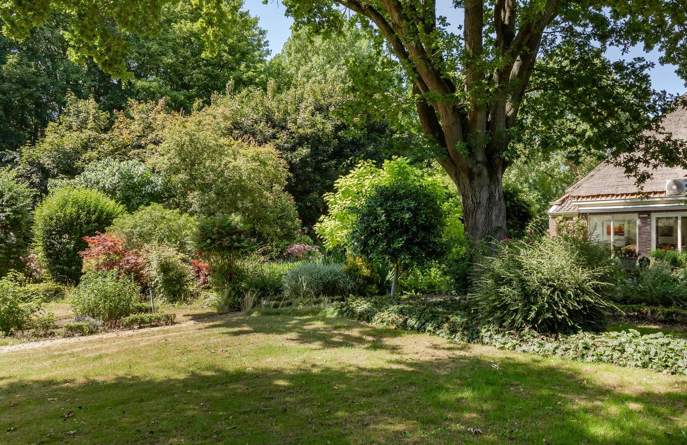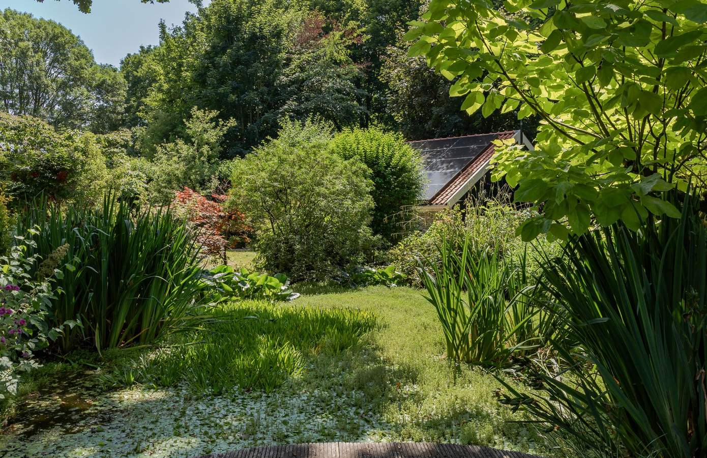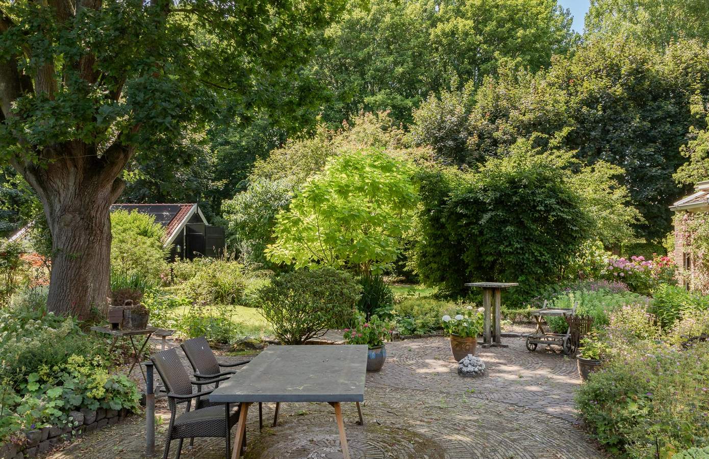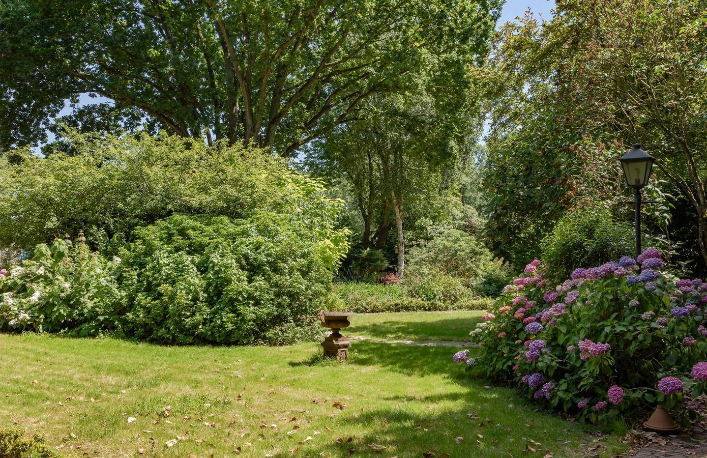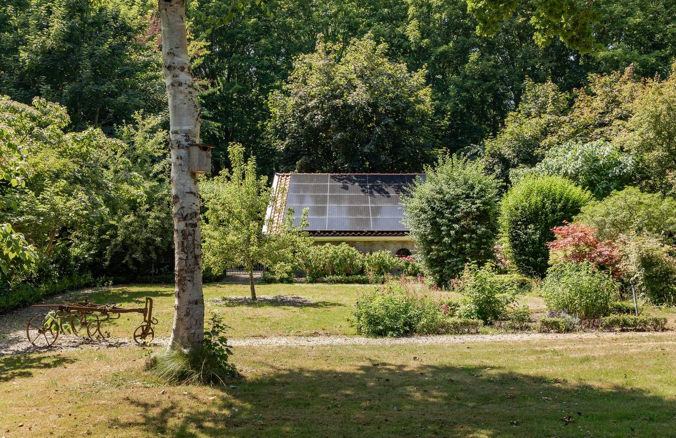 Rondom de boerderij ligt een schitterend aangelegde en goed onderhouden tuin. U waant zich in een park vol oude bomen, rozen, hortensiastruiken, kleurrijke borders en een diversiteit aan beplanting die het hele jaar door voor een sfeervol en levendig beeld zorgt. Meerdere terrassen, slim geplaatst op verschillende plekken in de tuin, maken het mogelijk om op elk moment van de dag van de zon of juist de schaduw te genieten, terwijl u uitkijkt over het groen en de vogels hoort fluiten. De verrassend diepe tuin grenst direct aan een park, waardoor de natuur letterlijk in uw achtertuin begint en het gevoel van vrijheid en ruimte versterkt.