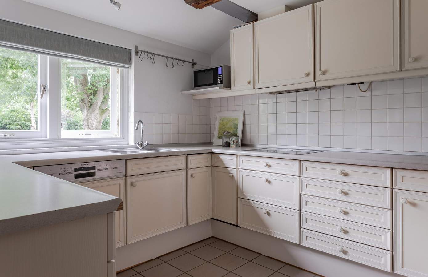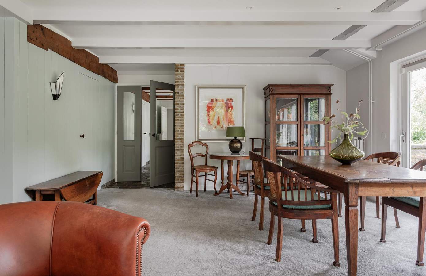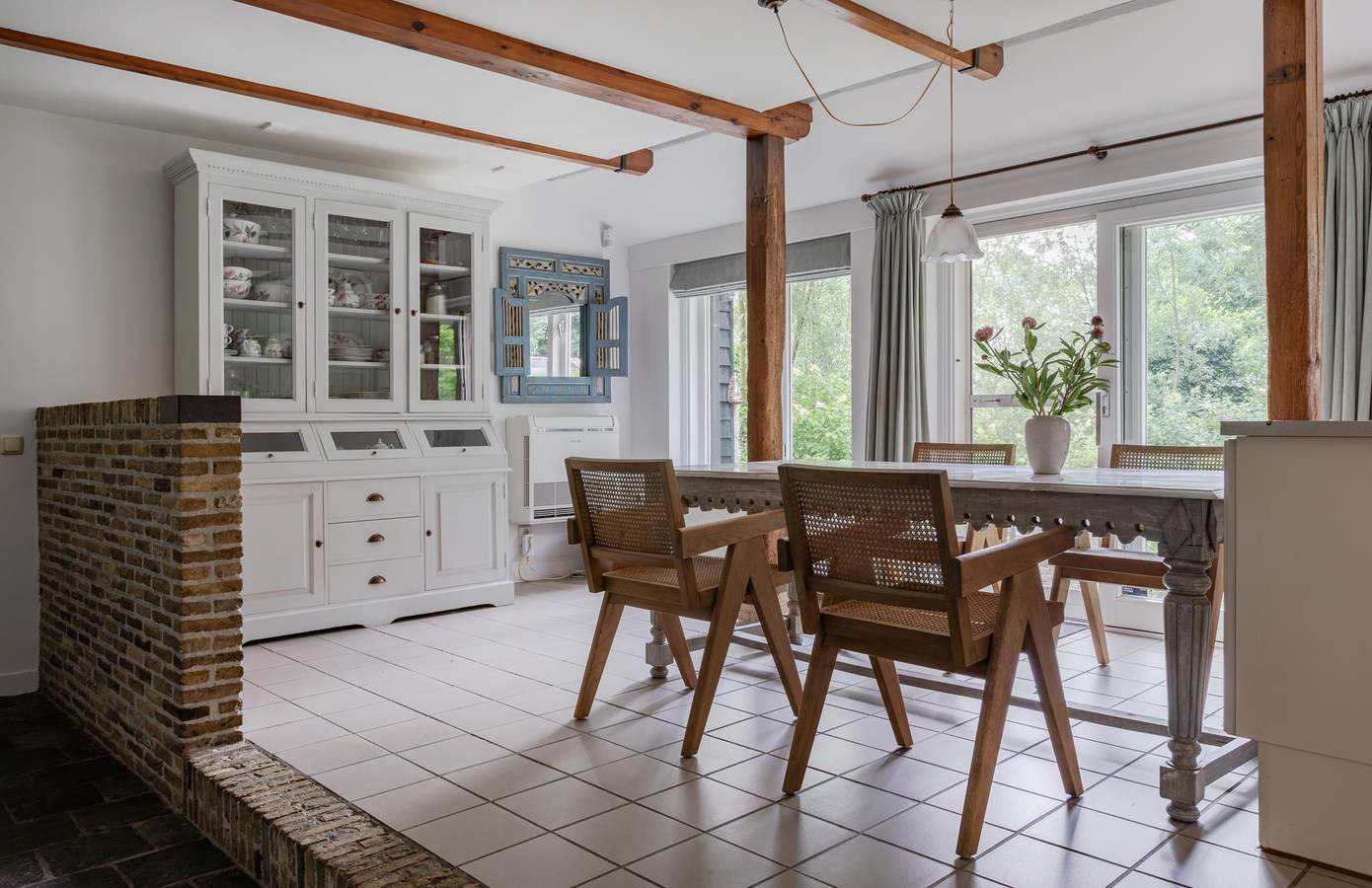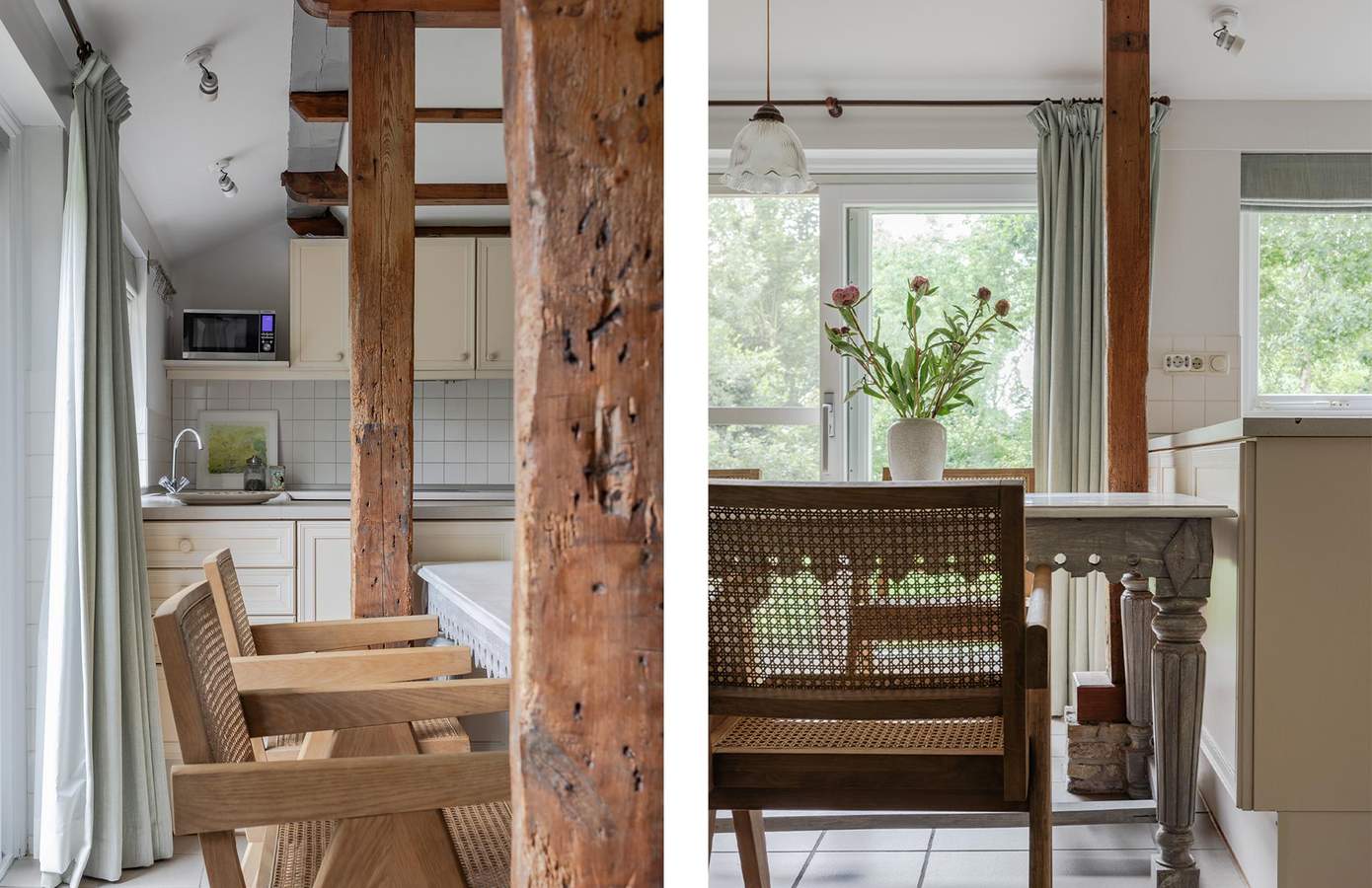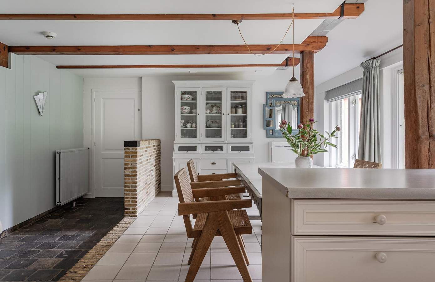 Leuk detail zijn de subtiele slijtageplekken aan de houten pilaren in de keuken: stille getuigen van de koeien die hier vroeger hun flanken zacht tegenaan schuurden, waardoor een klein stukje boerenleven van toen zichtbaar is gebleven. Het zijn precies dit soort details die deze boerderij zo bijzonder maken – kleine verhalen uit het verleden, zichtbaar gebleven in het hout en voelbaar in de sfeer van het huis.